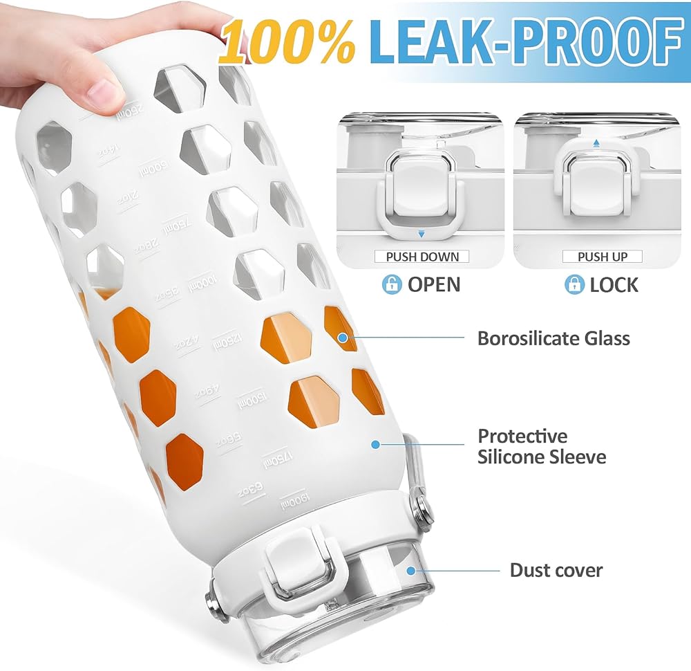 GLASS WATER BOTTLES WITH TIME TO DRINK:MUKOKO 1 liter waterbottle with time marker preserves the purity of water. This is a very handy way to keep up with water intake,stay hydrated and healthy. It's a great gift to have. They are great for home, work, and travel. The glass cup is a perfect gift for your family, friends, love ones, and also a perfect gift during ceremonies like Christmas or during mother's, father's day, or can offer as a birthday gift.