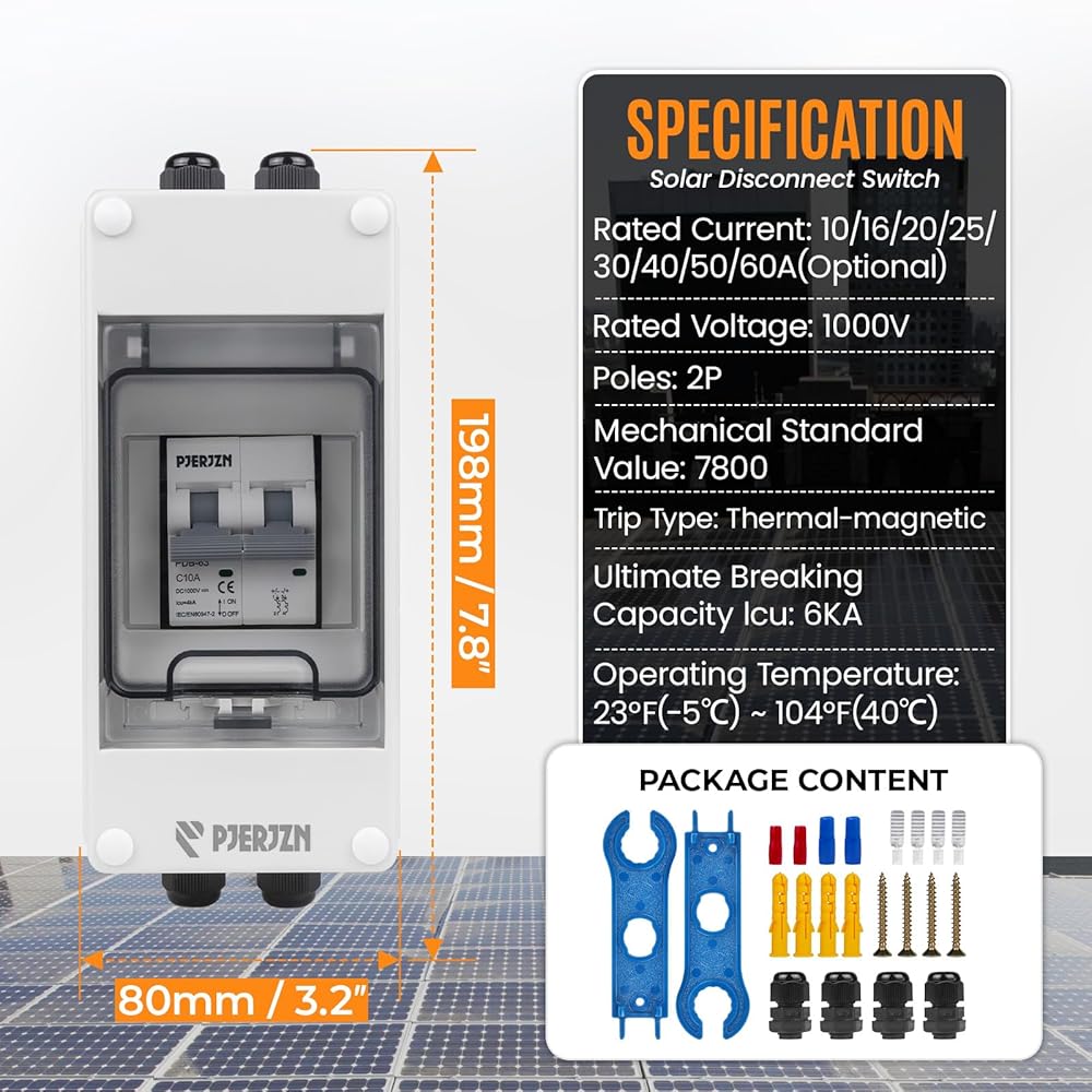 𝐏𝐫𝐞𝐦𝐢𝐮𝐦 𝐐𝐮𝐚𝐥𝐢𝐭𝐲: .Pjerjzn solar panel disconnector switch are newly upgraded with connectors that do not differentiate between male and female wires for quick installation. Made of premium quality material, thickened purple copper coil, wider operating handle, Transparent cover for easy checking of operational status, waterproof sealing silicone ring, IP65 waterproof and dustproof.