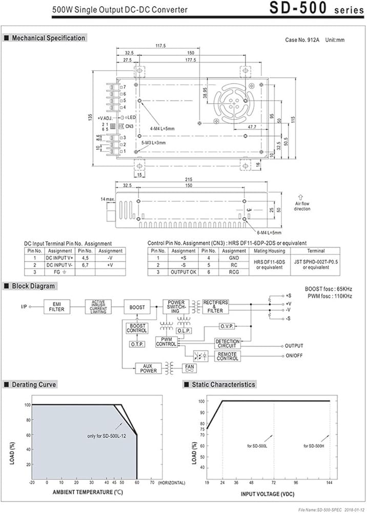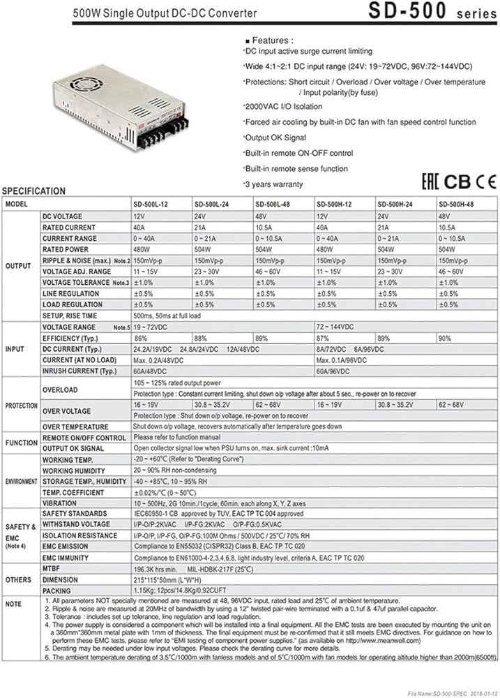 Power Entry Modules Power Supply Output Power : 401 - 500w Output Current : 0-40A Model Number : SD-500H-12 Output Frequency : 47~63Hz Input : 72~144VDC Output DC Voltage : 12V Rated Current : 40A Rated Power : 480W Dimension : 215*115*50mm (L*W*H)