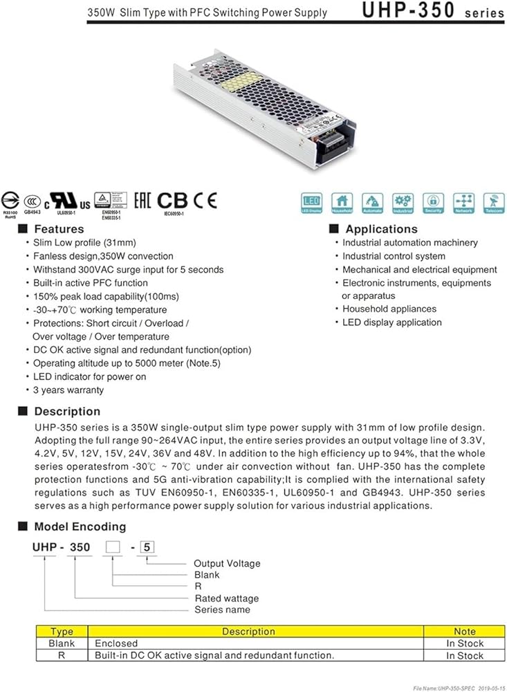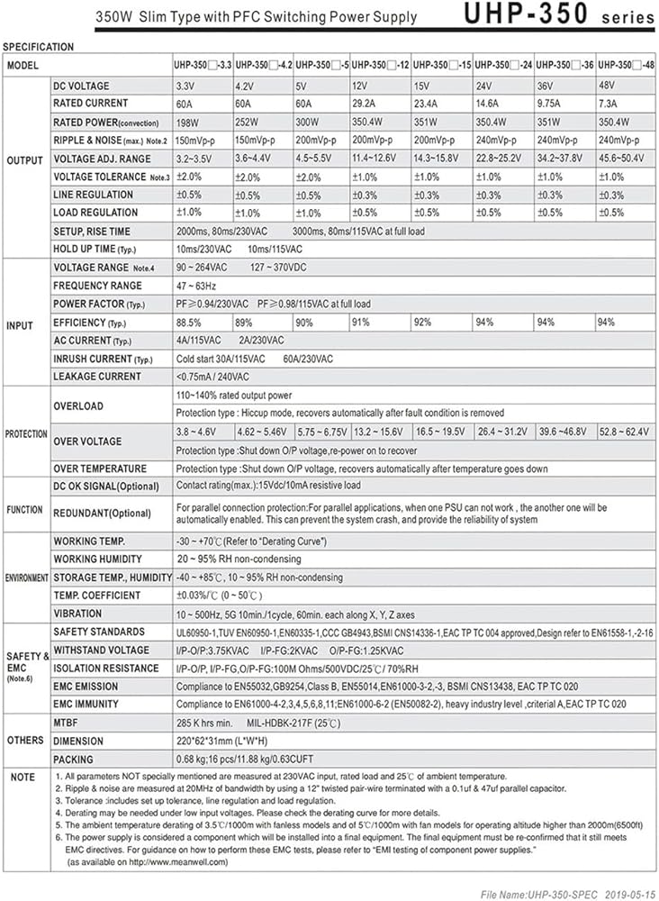 Power Entry Modules Power Supply UHP-350-3.3 UHP-350-5 UHP-350-12 UHP-350-15 UHP-350-24 UHP-350-36 UHP-350-48 UHP-35-55 switching power supply 4.2V Output Current : 0-30A Model Number : UHP-350-