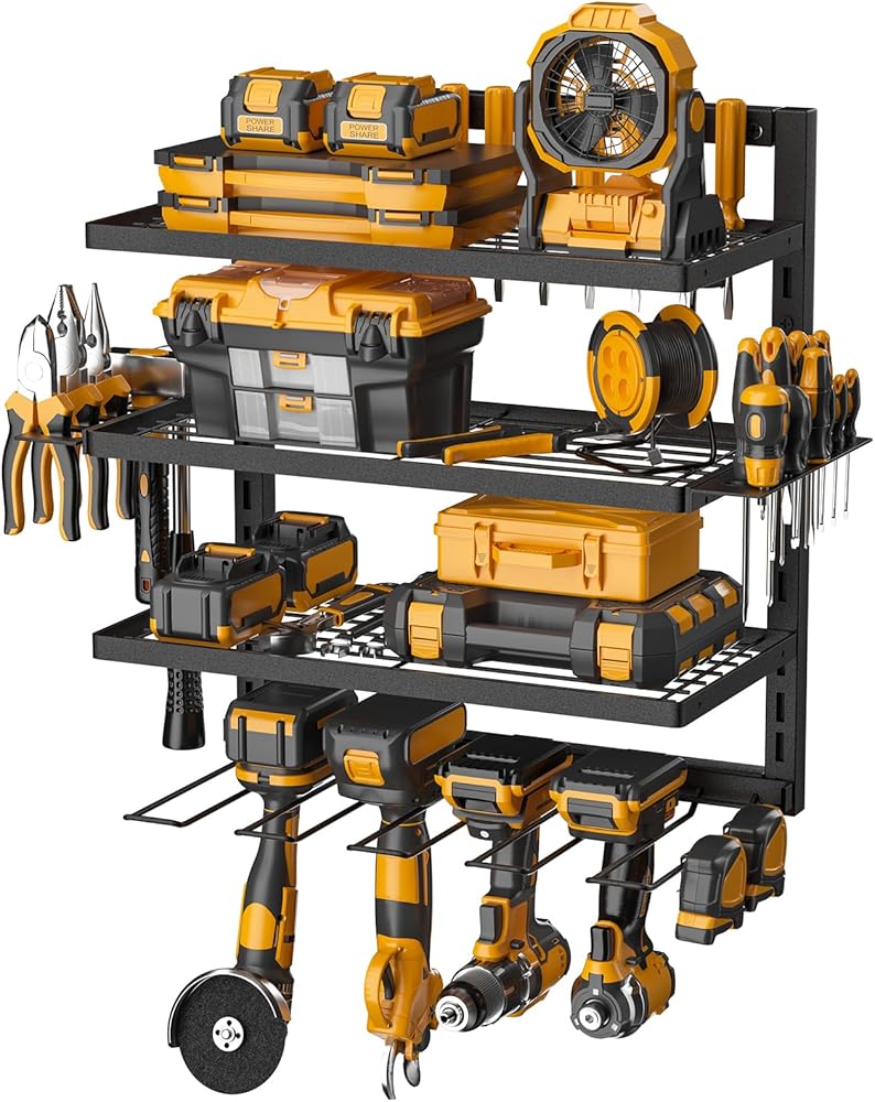 Power Tool Organizer Wall Mount, 4 Layer Storage Rack with 4 Drill Holders Cordless Tool Organizer, Heavy Duty Metal Power Tool Shelf, Garage Organization Utility Racks for Workshop Shed Pegboard