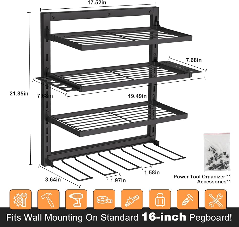 【𝐅𝐢𝐭𝐬 𝟏𝟔" 𝐏𝐞𝐠𝐛𝐨𝐚𝐫𝐝 𝐇𝐨𝐥𝐞𝐬】The upgraded power tool rack mounts perfectly to a 16-inch pegboard wall organizer. Don't bother with tilted cordless tool organizers or the inability to accurately mount to a pegboard anymore, choose the right garage organizer for your garage accessories!