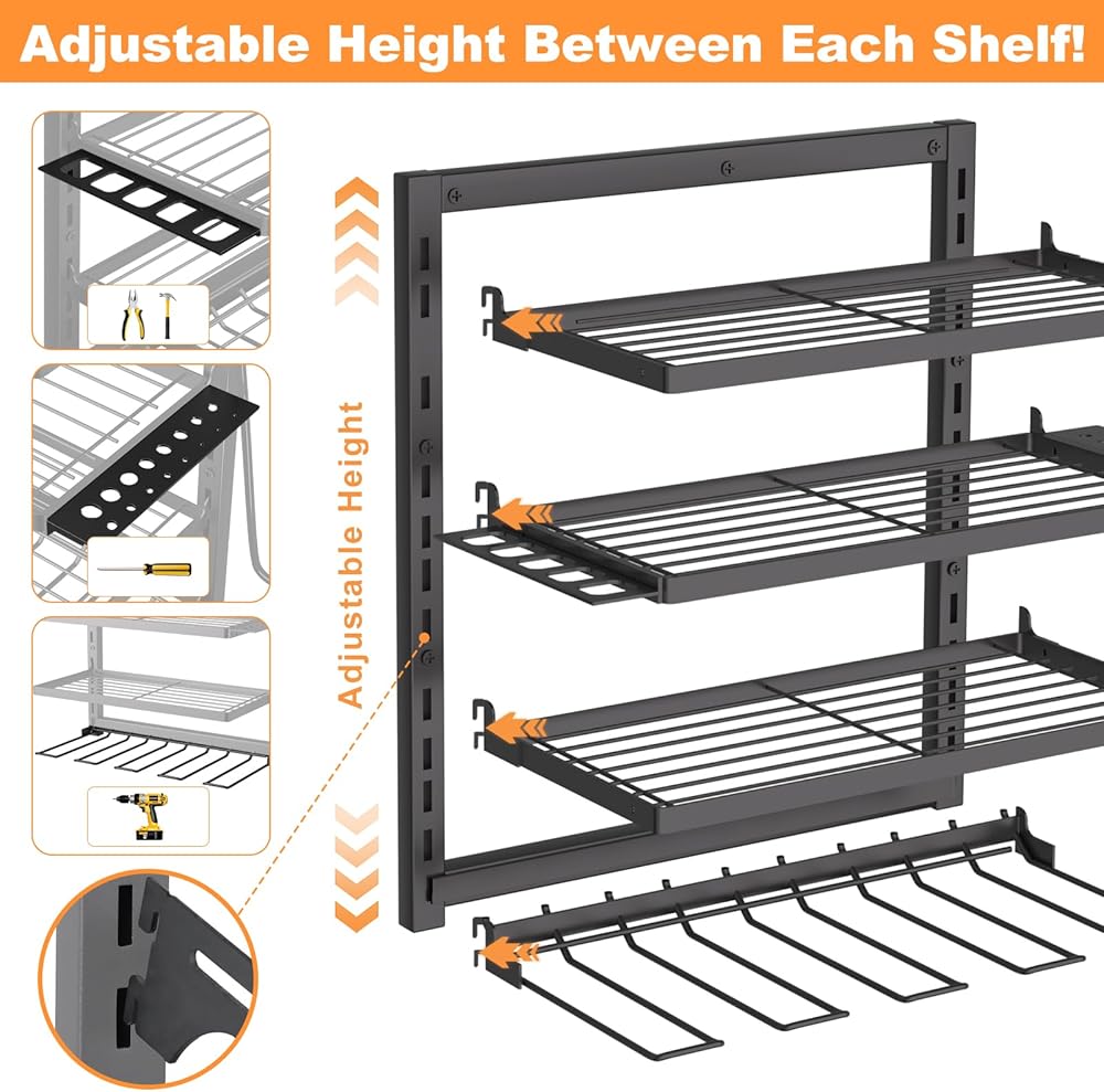 【𝐐𝐮𝐢𝐜𝐤 𝐀𝐬𝐬𝐞𝐦𝐛𝐥𝐲】The garage storage shelves with adjustable and removable design, very easy to install. Our cordless drill organizer wall mount are supplied with professional installation manual and accessories, refer to the professional installation manual, you can assemble a perfect power tool holder wall mounted storage shelves in just a few minutes.