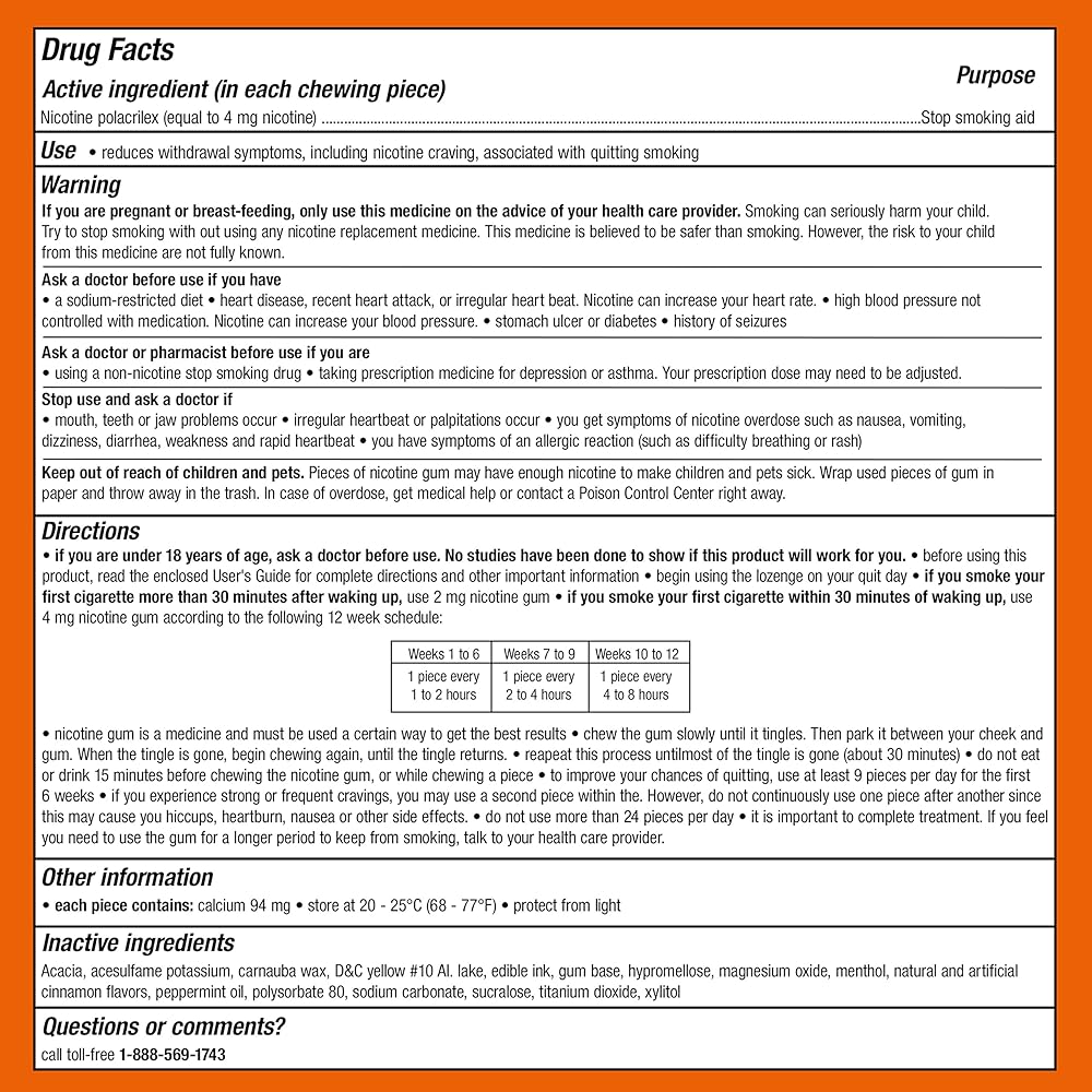 This gum offers withdrawal relief associated with smoking cessation. It is specially formulated with nicotine to help reduce withdrawal symptoms as well as cravings and can help you quit your smoking habit. The gum is aids in smoking cessation. Start with nine pieces of gum, then reduce your count each day until symtpoms and cravings stop.