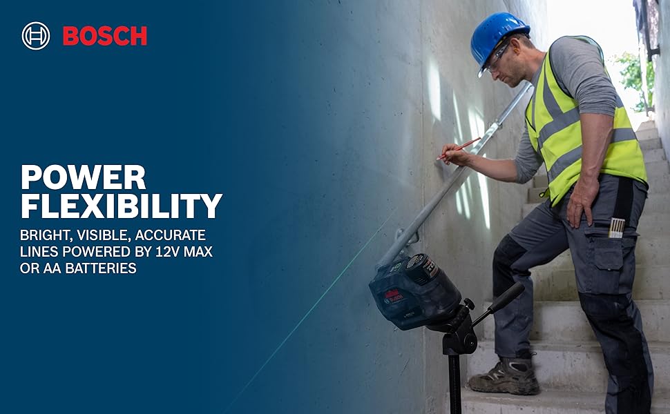 The Bosch GCL165-82CGL 12V Max Connected Green-Beam Cross-Line Laser with Plumb Points pairs remarkable power flexibility with green-beam technology to emit green lines up to 4X brighter than standard red beams. Use with the included 12V Max battery or AA batteries (sold separately) for enhanced versatility and longer runtime on the job. Built-in VisiMax™ technology monitors temperature and power consumption to deliver the brightest line for the application, optimize energy efficiency and provide long-term tool reliability. Full rubber overmold housing helps protect the level at every major impact point. IP65-rated (tool only), the laser can withstand tough, rainy conditions and is dust-tight for enhanced protection. The fine adjustment knob and pivot rotation provide accurate point-to-point alignment by allowing the laser to rotate around the point while turning. Fitted with a U-shaped laser outlet window to provide a wider horizontal reach of the laser line. With a working range of up to 125 Ft., the bright, thin lines provide an accuracy of 1/8 In. at 30 Ft. Further extend the range to 330 Ft. (measured at the horizontal line) with the level's receiver compatibility (sold separately). Equipped with a Smart Pendulum System, the tool self-levels, will indicate any out-of-level condition and then locks when switched off for secure transport. Fully featured with Bluetooth® connectivity, control the setup of the laser from across the room with a paired smartphone and the free Bosch Leveling Remote App. Keep a handle on the laser with the rubber grip base and easily position using the strong magnets or ¼ In. threading mount. Complete with an outstanding operating time of 8 hours (using a Li-Ion battery), for all-day power and productivity.