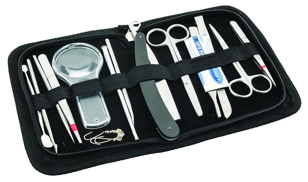 14 PIECE SET || Includes: 2 scissors (4" fine point, 5" blunt end), 2 forceps (4" fine point, 5" blunt end), 1 straight needle, 1 arrow needle, 1 seeker blunt end needle, 1 section lifter, 1 scalpel with blade (4.5"), 1 scalpel handle #4, 1 scalpel blade #20, 1 razor with covered edge, 1 acrylic bi-focal magnifier, 1 blow pipe, 1 chain & hook
