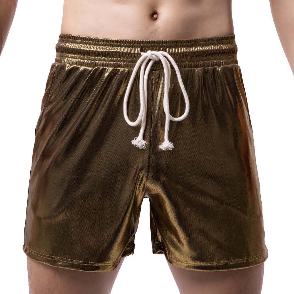 Mens Metallic shorts made of 80% polyester+20% spandex material,soft and flexible,give you a comfort wearing experience,bronzing fabric make you look more eye-catching in the crowd
