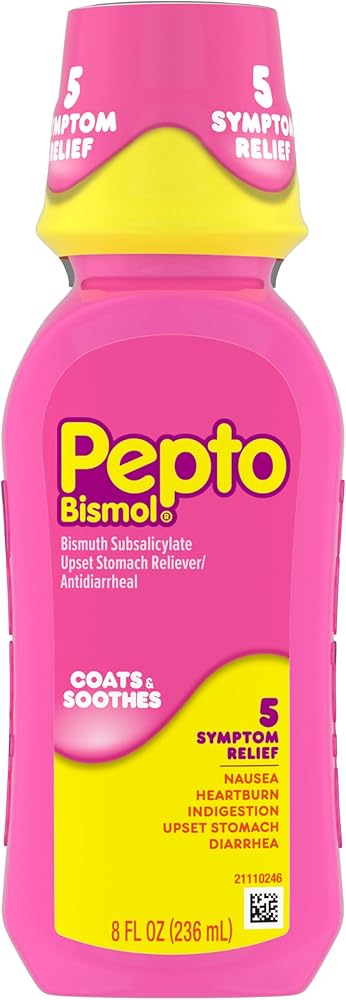 Pepto Bismol Liquid, Upset Stomach Relief, Nausea Relief, Heartburn Relief, Indigestion Relief, Anti Diarrhea Medication for Adults - 5 Symptom Fast Relief, 8 oz (Packaging May Vary)