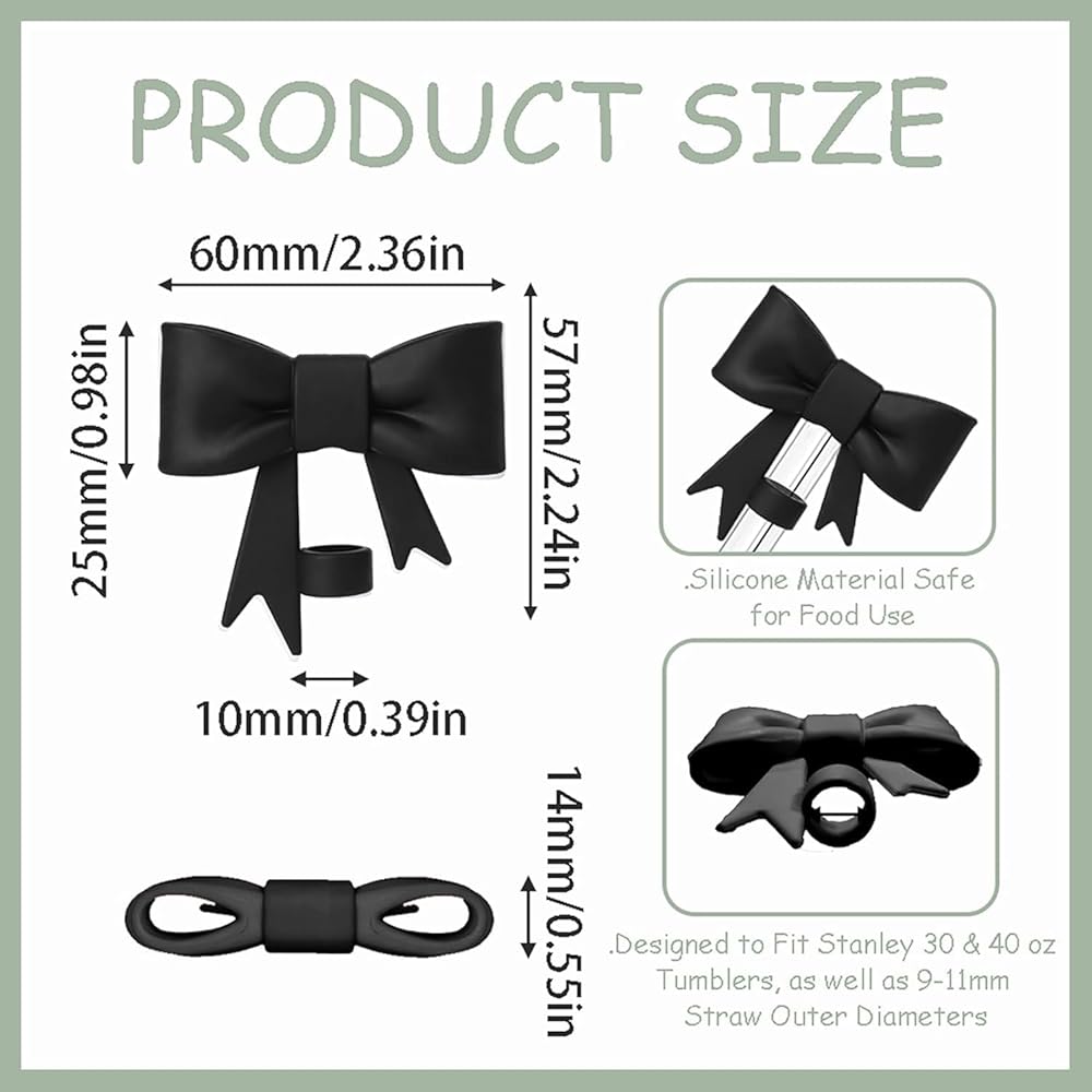 Stanley Cup Accessories Set, Bow Straw Toppers, Water Bottle Handle Strap, Straw Cover Boots for Stanley, Silicone Straw Toppers for Tumblers, Bow Cup Accessories for 20&30&40Oz (Black)