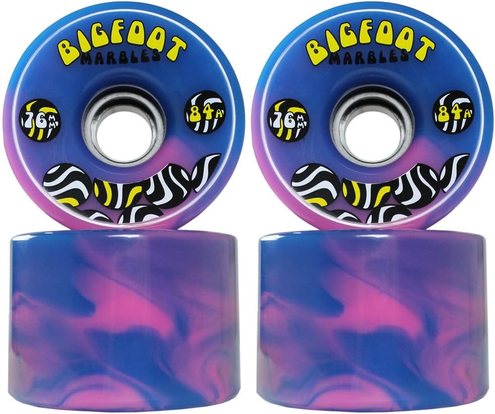 WHEELS: Bigfoot Marbles offer the hardest super high rebound formula in the Bigfoot collection. This new swirl formula was chosen based on rider feedback, the 84a hardness and 51mm wide footprint make the Marbles perfect for the rider looking to board fast and be able to maintain speed. Once broken in these wheels are great for sliding too. These wheels Measure 76mm in diameter, and have a 51mm contact patch. The wide footprint is what sets these wheels apart, they offer the rider so much more!