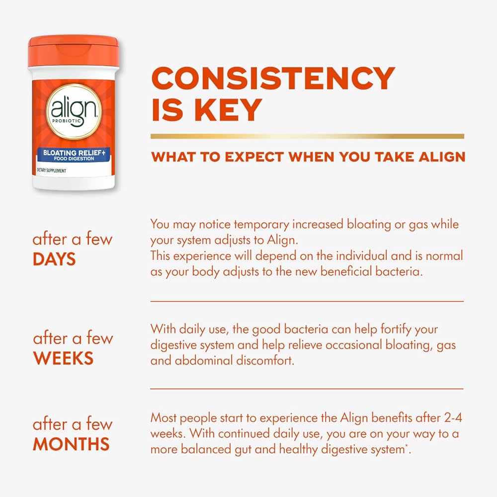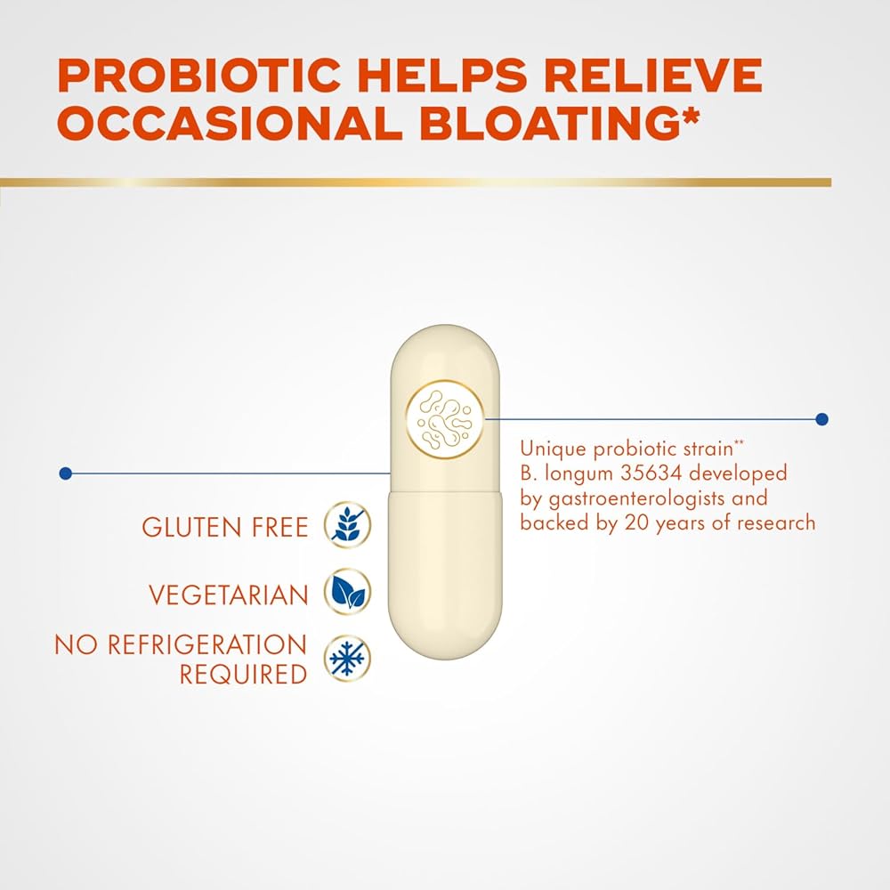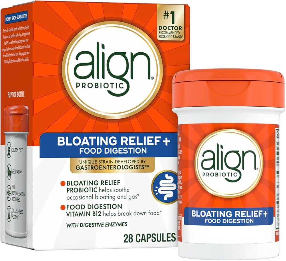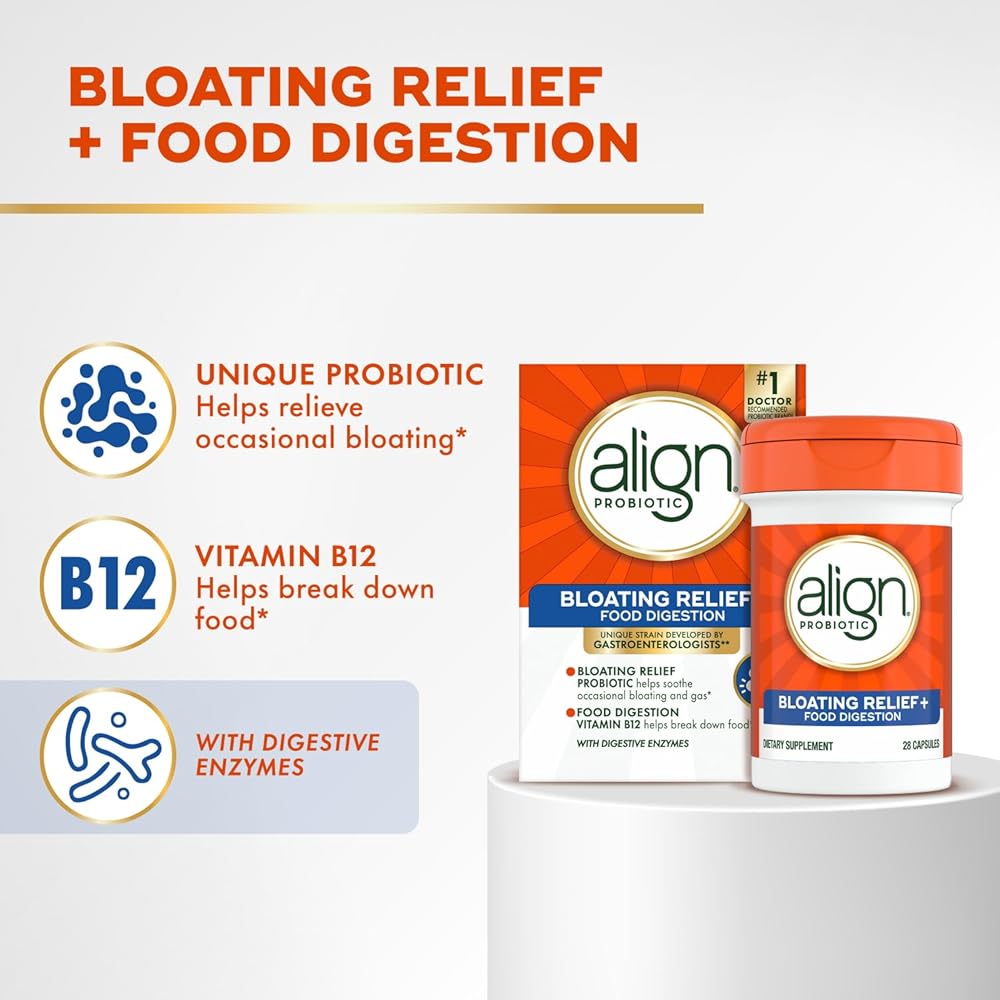 THE PROBIOTIC BRAND DOCTORS RECOMMEND MOST. Recommended by Gastroenterologists two times more than any other probiotic, Align daily probiotic supplement is the #1 doctor and gastroenterologist recommended probiotic brand. Align Bloating Relief + Food Digestion is a daily probiotic supplement that adds good bacteria to help relieve occasional bloating.* Align Bloating Relief + Food Digestion contains the unique strain Bifidobacterium 35624TM, which was developed by Gastroenterologists, is backed by 20+ years of research, and naturally helps soothe occasional abdominal discomfort, gas, and bloating.* It also contains vitamin B12 which supports the breakdown of fats and proteins.* Each capsule also contains a complementary, proprietary blend of 5 digestive enzymes - amylase, protease, lactase, cellulase, and lipase. Taking one capsule a day helps to maintain your digestive system's natural balance and helps support the metabolism of food.* Align Bloating Relief + Food Digestion is vegetarian, gluten-free, soy-free, dairy-free, and does not require refrigeration.*THESE STATEMENTS HAVE NOT BEEN EVALUATED BY THE FOOD AND DRUG ADMINISTRATION. THIS PRODUCT IS NOT INTENDED TO DIAGNOSE, TREAT, CURE, OR PREVENT ANY DISEASE.Among Doctors and Gastroenterologists who recommended a brand of probiotic in ProVoice 2022 survey