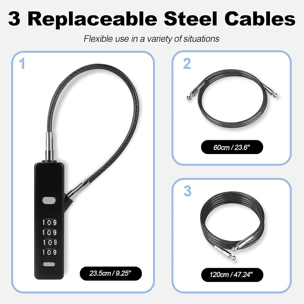 Three Flexible Ropes: The lock includes three PVC-coated steel cables in varying lengths—9” (23 cm), 23.6” (60 cm), and 47.2” (120 cm). Whether you need a small bike lock, a gate lock for outdoor fences, or a snowboard lock, these replaceable cables provide versatility for various locking scenarios.