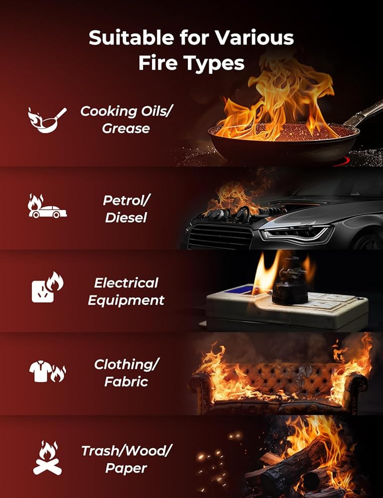 Suitable for Various Fire Types: This extinguisher is designed for ordinary household fires, making it ideal for trash, wood, paper, cooking oil/grease, petrol/diesel, electrical, and fabric fires—versatile fire safety for home, office, and car