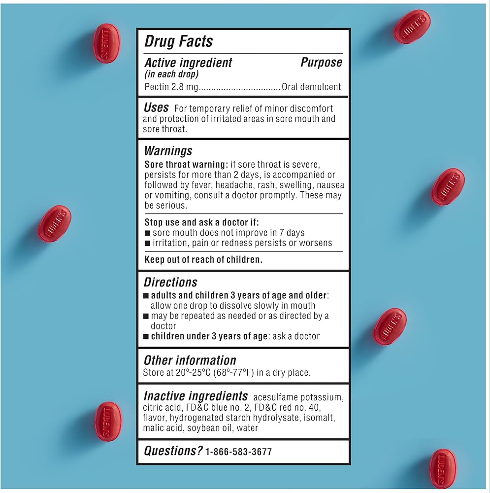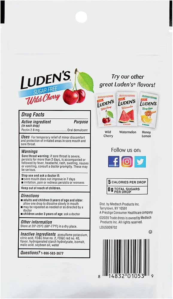 For over 100 years, Luden's has been soothing irritated and sore throats with our great tasting drops. Luden's deliciously soothing throat drops help relieve minor discomfort and protect irritated areas in a sore mouth and a sore throat so you can get on with your day. Luden's Throat Drops come in a variety of delicious flavors and are great for the whole family at home or on-the-go. This diabetic friendly product comes with a resealable bag of individually wrapped Sugar Free Wild Cherry flavor throat drops. Luden's also offers Dual Relief Wild Cherry cough drops for temporary relief of sore throats and cough associated with cold and flu symptoms. Allow one drop to dissolve slowly in mouth and repeat as needed or as directed by a doctor. For use by adults and children 3 years of age and older.