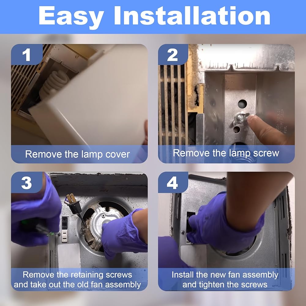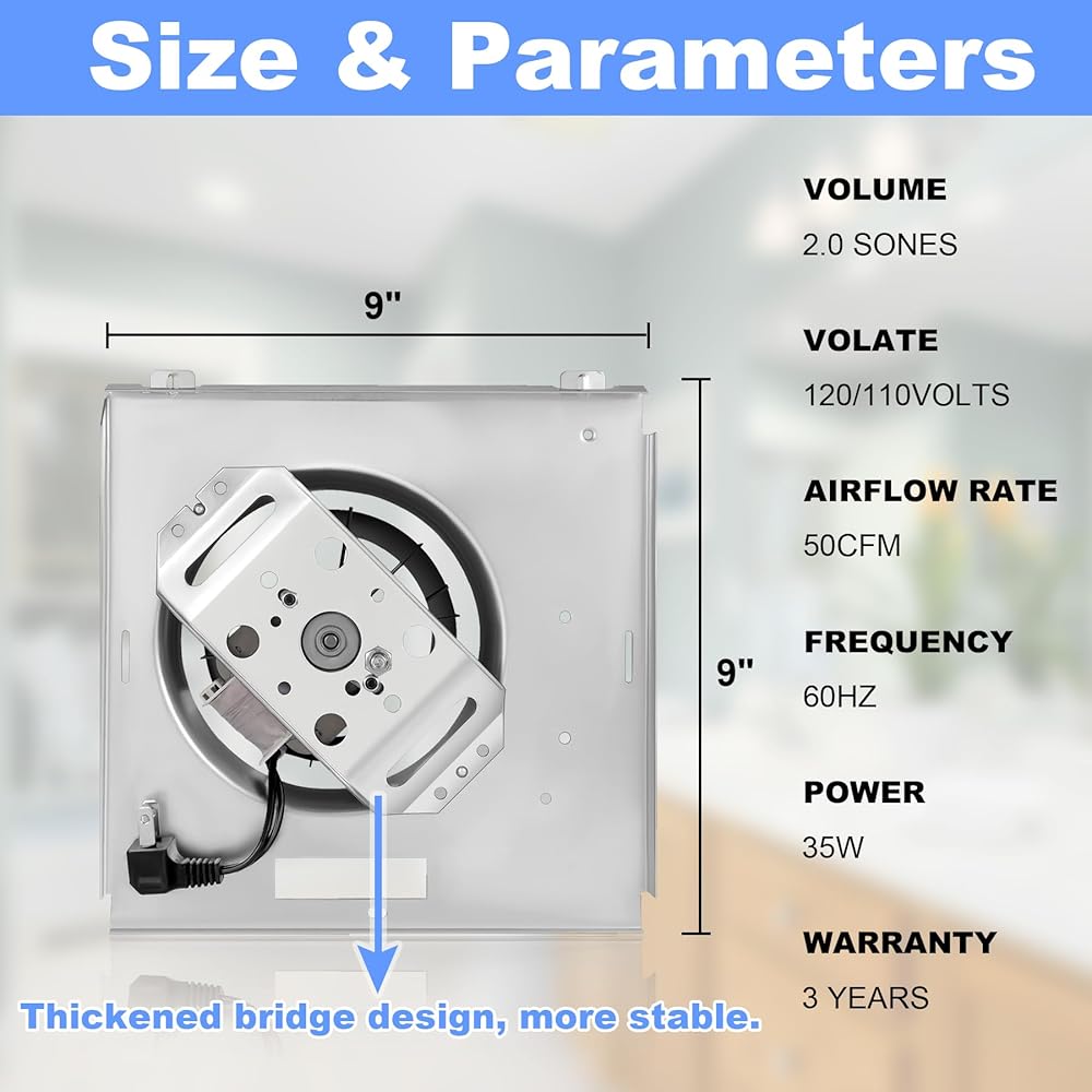 【Package Include】bathroom exhaust fan*1(110V/120V、60Hz、0.9AMPS、50CFM、2.0 Sones),cleaning cloth*2(Convenient to clean the dust when you dismantle the old fan),gloves*1.We promise that you are not just buying a bathroom fan motor kit, but also our full after-sales service, no matter what reason you are not satisfied with the product, we will be happy to replace or return it for you!