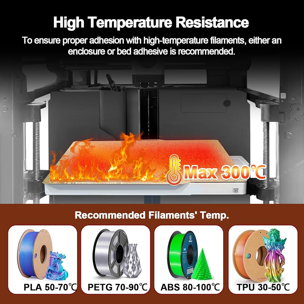 【Compatible Filament】PEI build plate supports a wide range of filaments, including PLA, PETG, TPU, ABS, ASA, PVA, PET, PA, PC, Nylon, and Nylon-CF, with a high-temperature resistance up to 300°C.