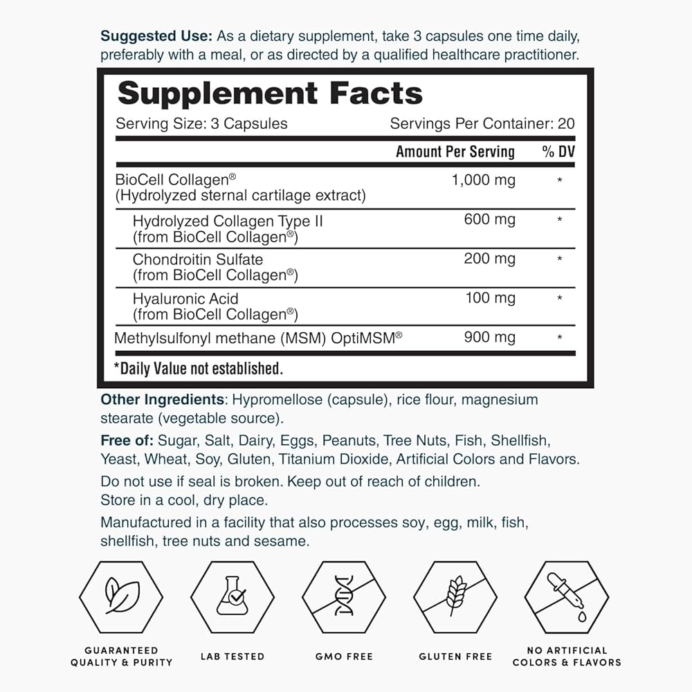 BioCell Collagen is a multifaceted healthy aging ingredient that contains a patented composition of naturally occurring hydrolyzed collagen type II (60%), chondroitin sulfate (20%), and hyaluronic acid (10%) in a highly absorbable matrix form (not a blend)* BioCell Collagen helps maintain existing hyaluronic acid within the body*