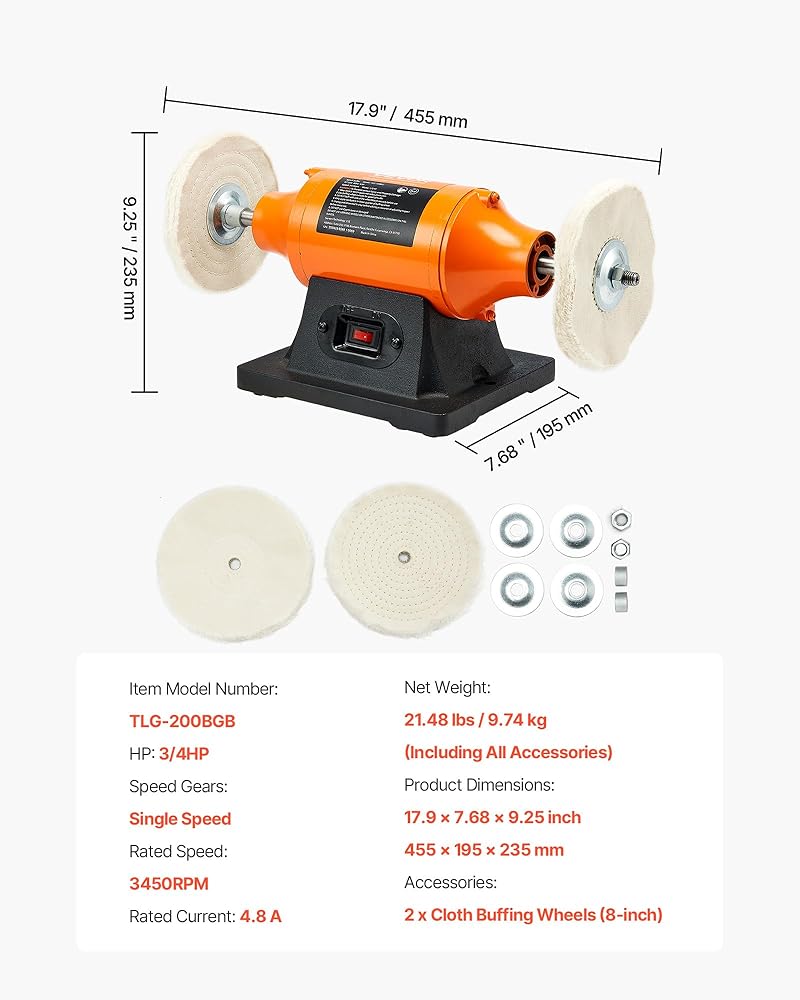 High-Powered Motor: This 1/2HP, 3.27A powerful bench buffer polisher with stepless speed control delivers excellent polishing performance, easily handling metal polishing, wood sanding, jewelry repair, etc — ideal for professional and DIY projects
