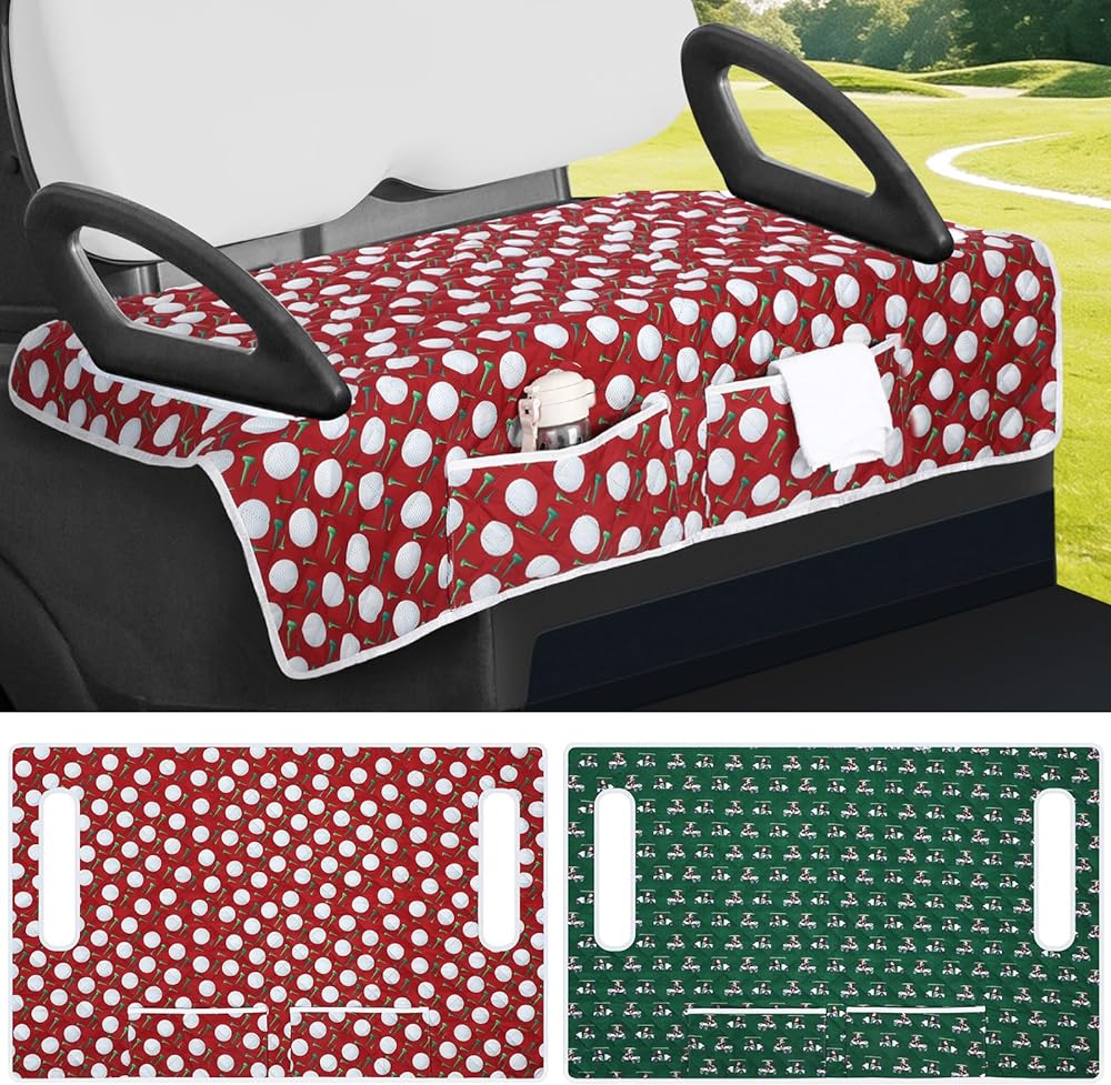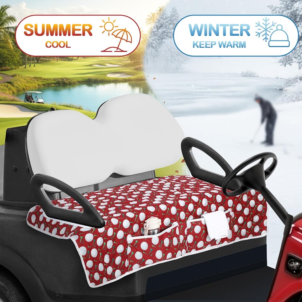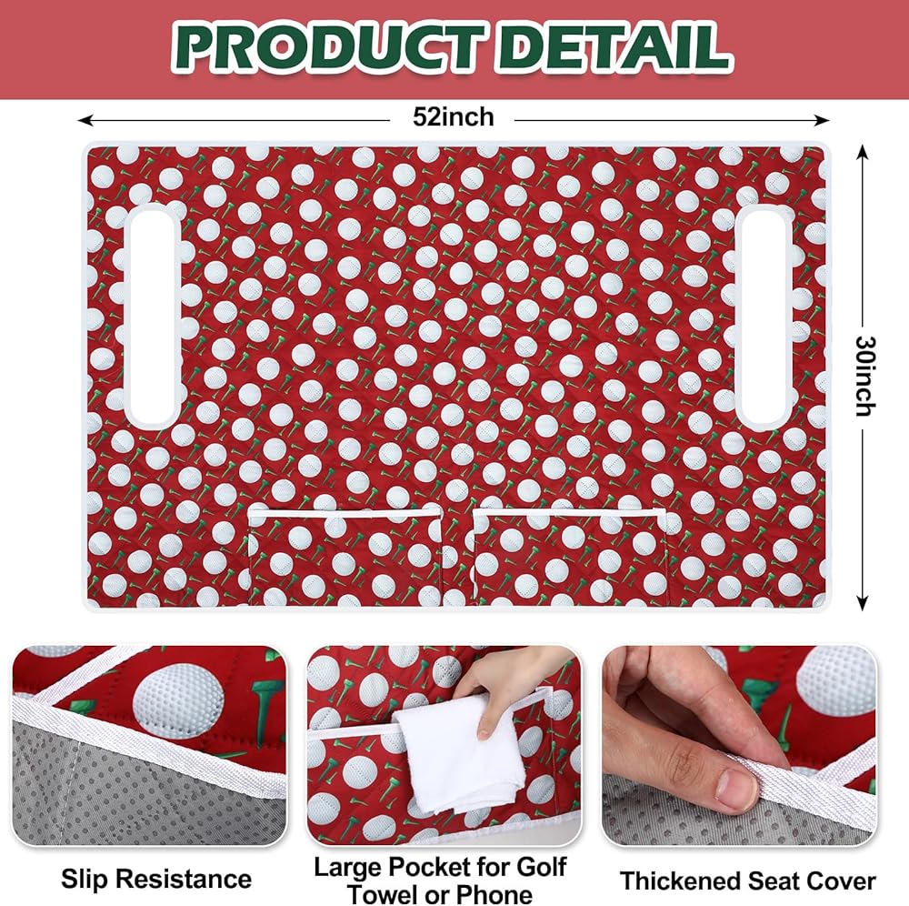 Practical Front Pockets: these golf cart seat decorations come with 2 large front pockets that double as convenient storage space; It provides an easy to reach location for your golf accessories, snacks, mobile devices or other personal items, allowing you to enjoy a worry free golf experience