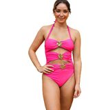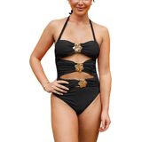- Hollow out one piece swimsuit with metral flower as decoration at front.