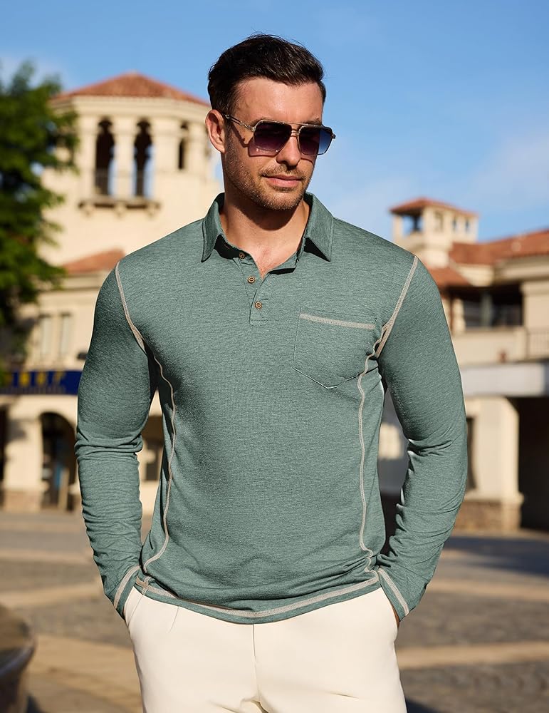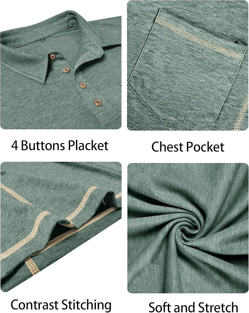 【Feature】:Men's fashion polo shirts features with polo collar, chest pocket,4 button closure, subtle contrast stitching throughout, faux wood buttons, the contrasts will wake up denim and pants.