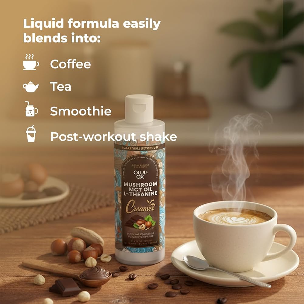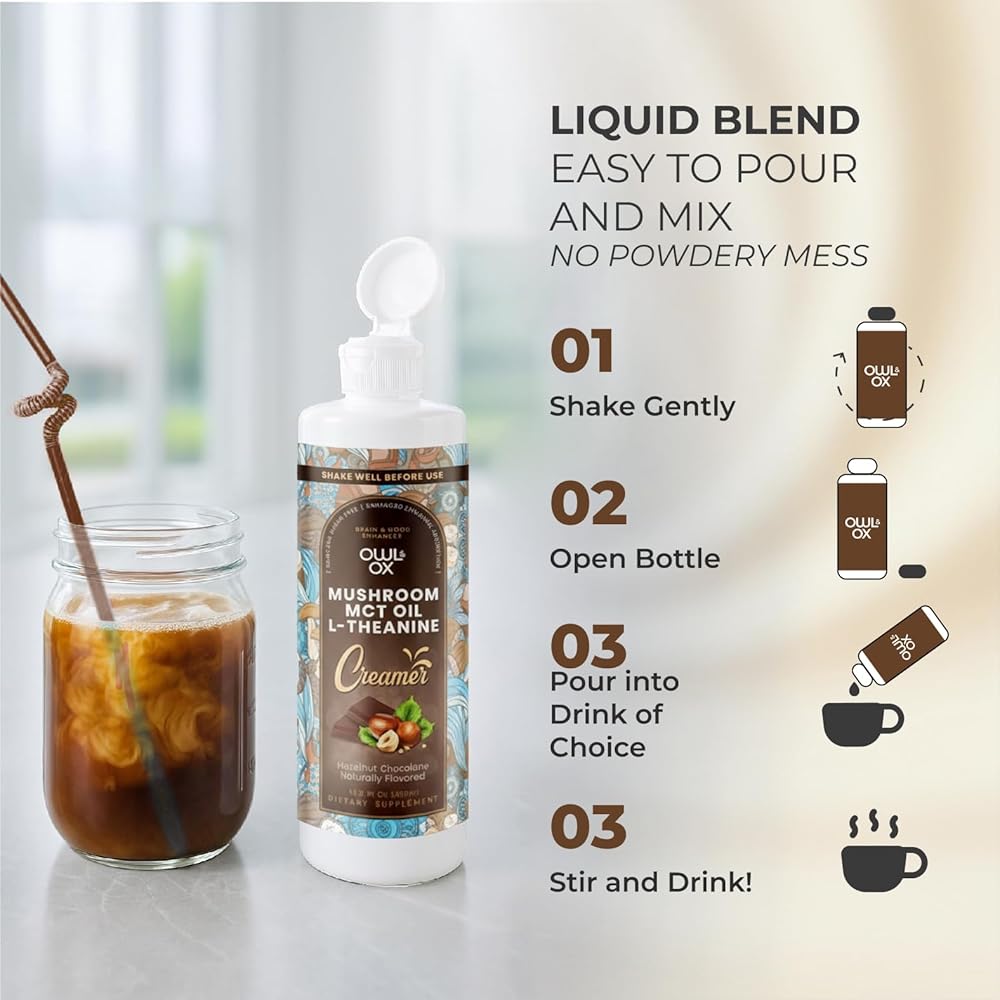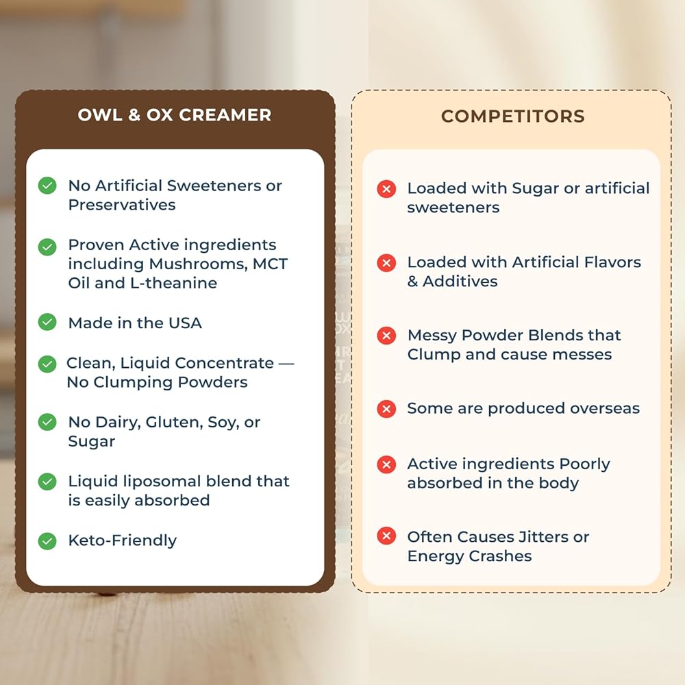 KETO FRIENDLY: OWL & OX Brain and Mood Creamer uses purposeful active ingredients: Mushroom Blend, MCT Oil, L-Theanine and is 100% Dairy Free, Sugar Free, Non-GMO, Vegan, Keto Friendly, Lab Tested, Manufactured in cGMP facility and made with no artificial flavors or sweeteners.