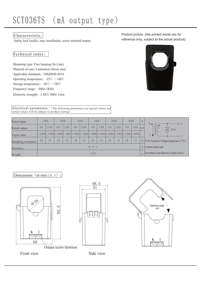 SCT036TS Input 100A/200A/300A/400A/500A/600A Output 0.1A Accuracy 1% Split Current Sensor AC Current Transformer(100A-0.1A 1)