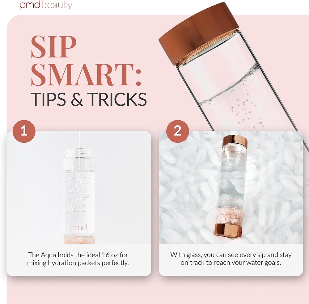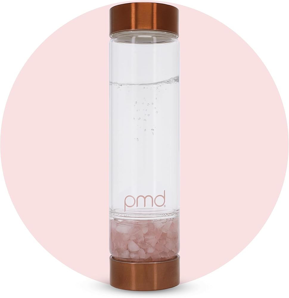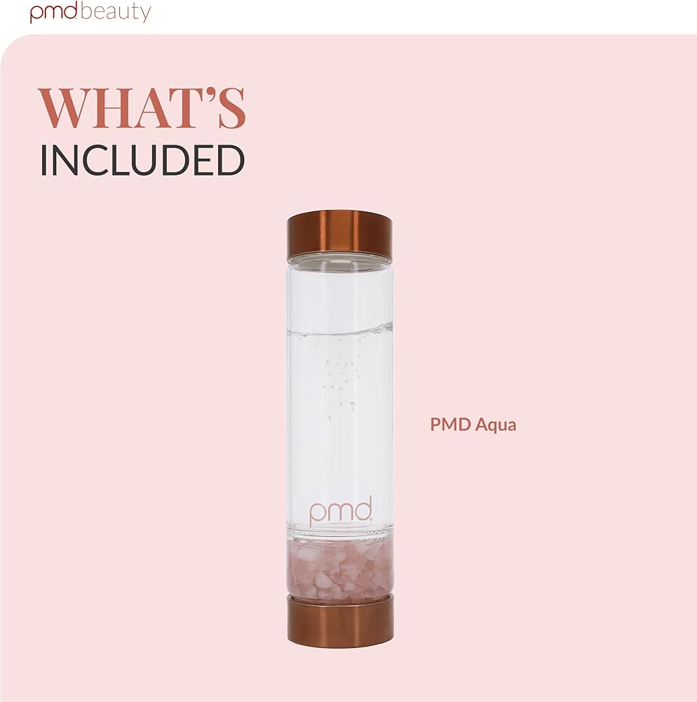 PMD Beauty Aqua Glass Water Bottle with Grade-A Rose Quartz 16.2 oz BPA-Free Reusable Glass Bottle, Sleek Minimalist Design for Clean Hydration & Everyday Use