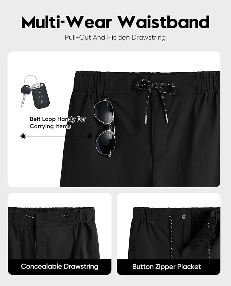 【Zipper Pockets & Elastic Waist】 Functional pockets store various equipment and the hidden zippper pockets help your valuables won't fall out of. Men's amphibious shorts has an elastic waist with drawstring for easy adjustment, ensures the mens amphibious shorts won't slide down when workout or running. Drawstring can be pulled out and hidden inside the shorts.