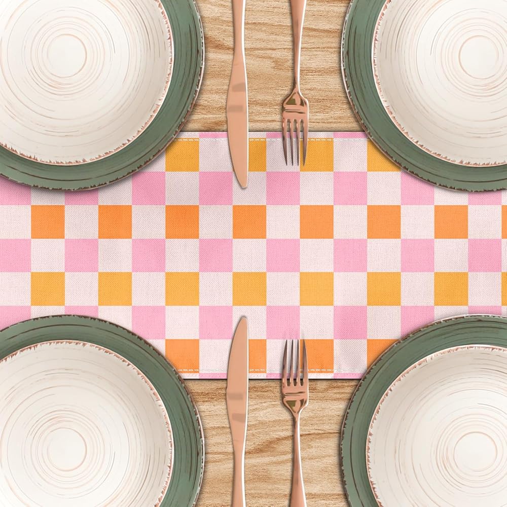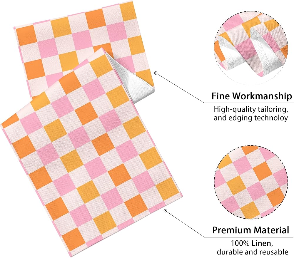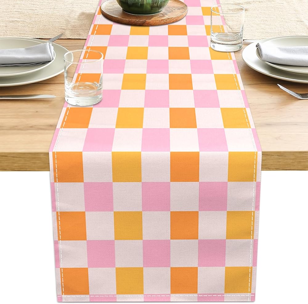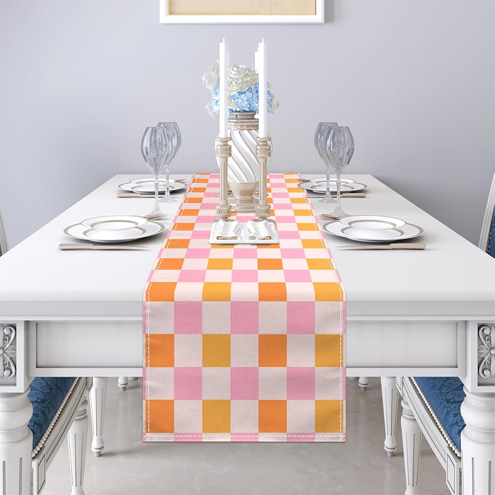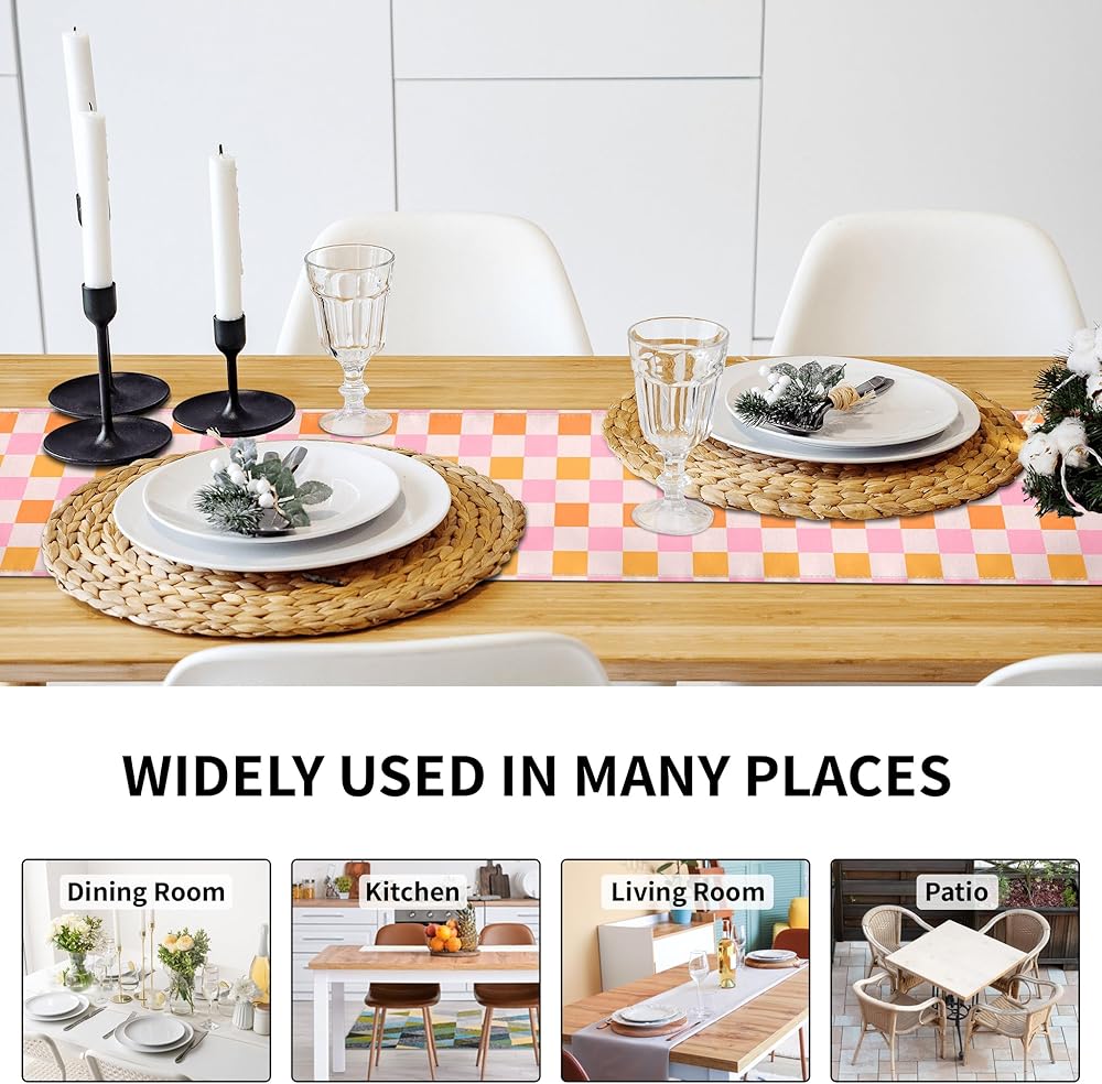 Beautiful & Practical Table Runner: These orange red geometric checkered decor rustic linen table runner tablecloth can not only be used as a dresser cover top, coffee table runner, mantle scarf, table centerpieces for kitchen dining room. It also insulates and protects countertops from scratches, heat and other damage, extend the use of dining table