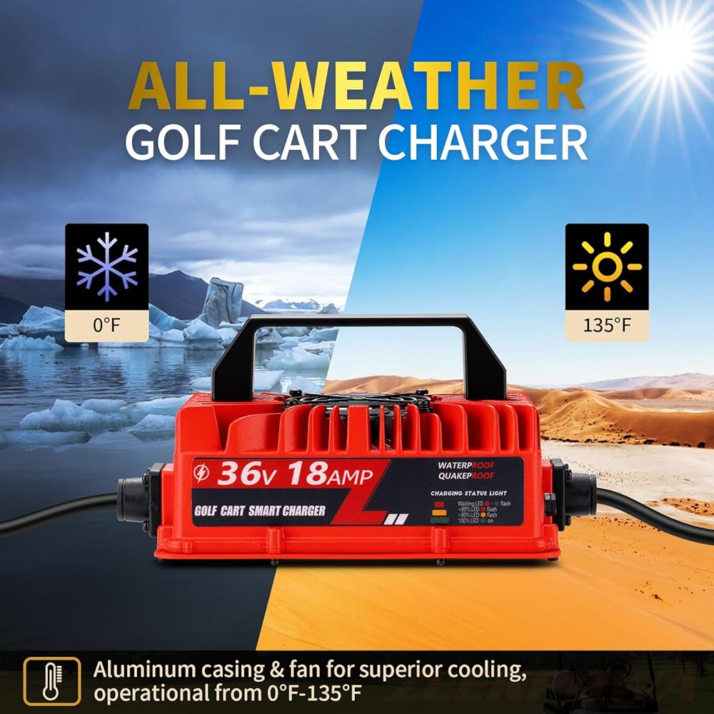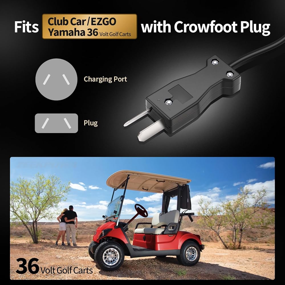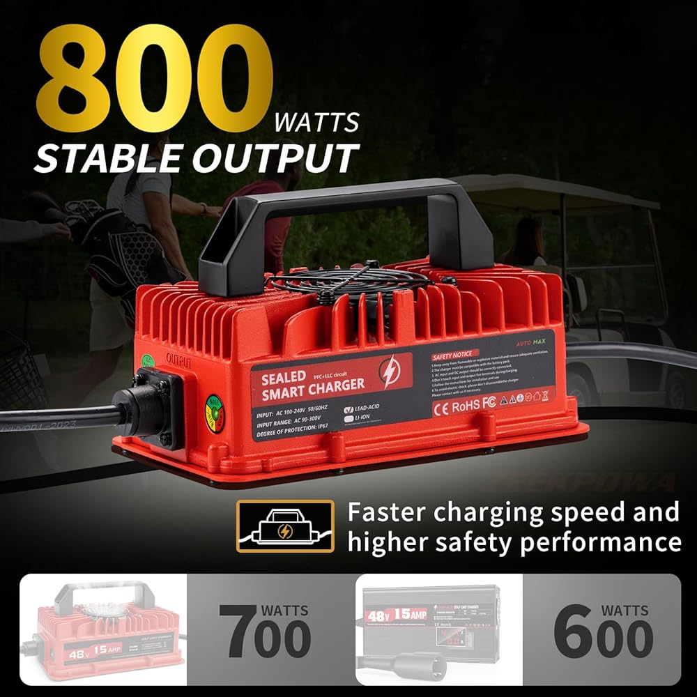 【48V Golf Cart Charger Fast Charging】48 Volt 15 Amp Golf Cart Charger for Club Car with 3-Pin Round Plug is designed for lead-acid batteries. With a maximum output of 800W, it ensures fast, reliable charging to keep your golf cart ready to go.