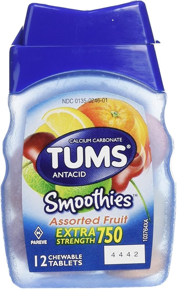 TUMS Smoothies Extra Strength Antacid Chewable Tablets get to work in seconds, so you can forget your heartburn and get back to the moments that matter. TUMS extra strength chewable antacid tablets contain 750 mg of calcium carbonate to quickly and effectively fight heartburn and relieve sour stomach, acid indigestion and upset stomach associated with these symptoms. These smooth tasting and delicious fruit flavored antacid tablets neutralize acid on contact, giving you fast extra strength heartburn relief. Adults and children 12 years and older may chew two to four antacid chewable tablets as symptoms occur or as directed by a doctor. Known as a trusted brand to fight heartburn fast for 90 years, TUMS is America's #1 antacid and the #1 physician, pharmacist and OBGYN-recommended adult antacid brand. These TUMS antacid tablets come in a resealable bottle that is easy to take on the go in a purse or pocket so you're ready when heartburn strikes. TUMS helps you love food back.