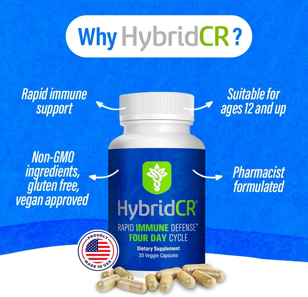 RAPID IMMUNE SUPPORT – HybridCR is the first pharmacist formulated, all-natural booster to rapidly support your immune system. Designed for Daily IMMUNE Wellness (1/day) or Rapid Immune Boost (3/day for 4 days) to rapidly boost your immune system. Hybrid CR is specifically formulated to work fast to help your body's natural immune system