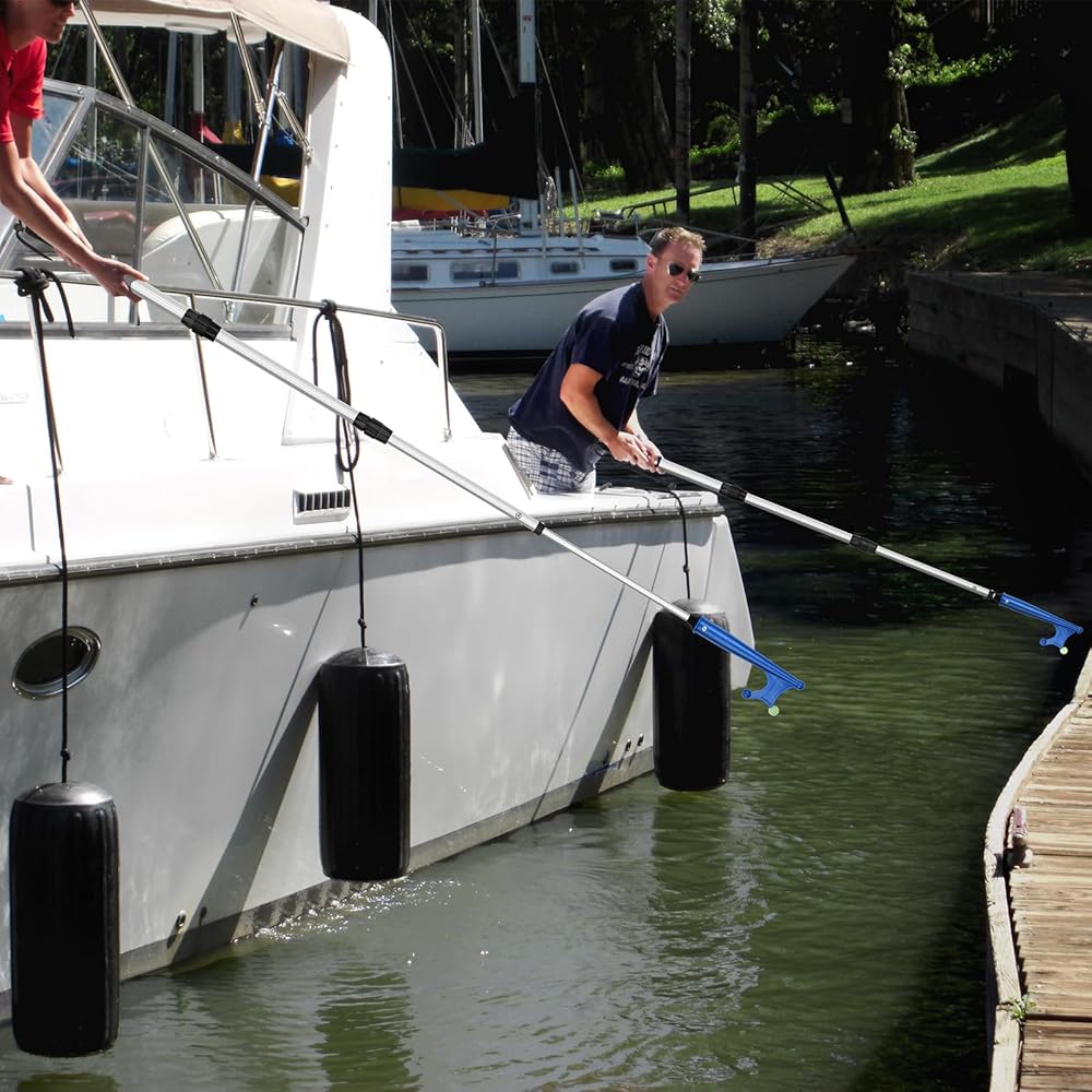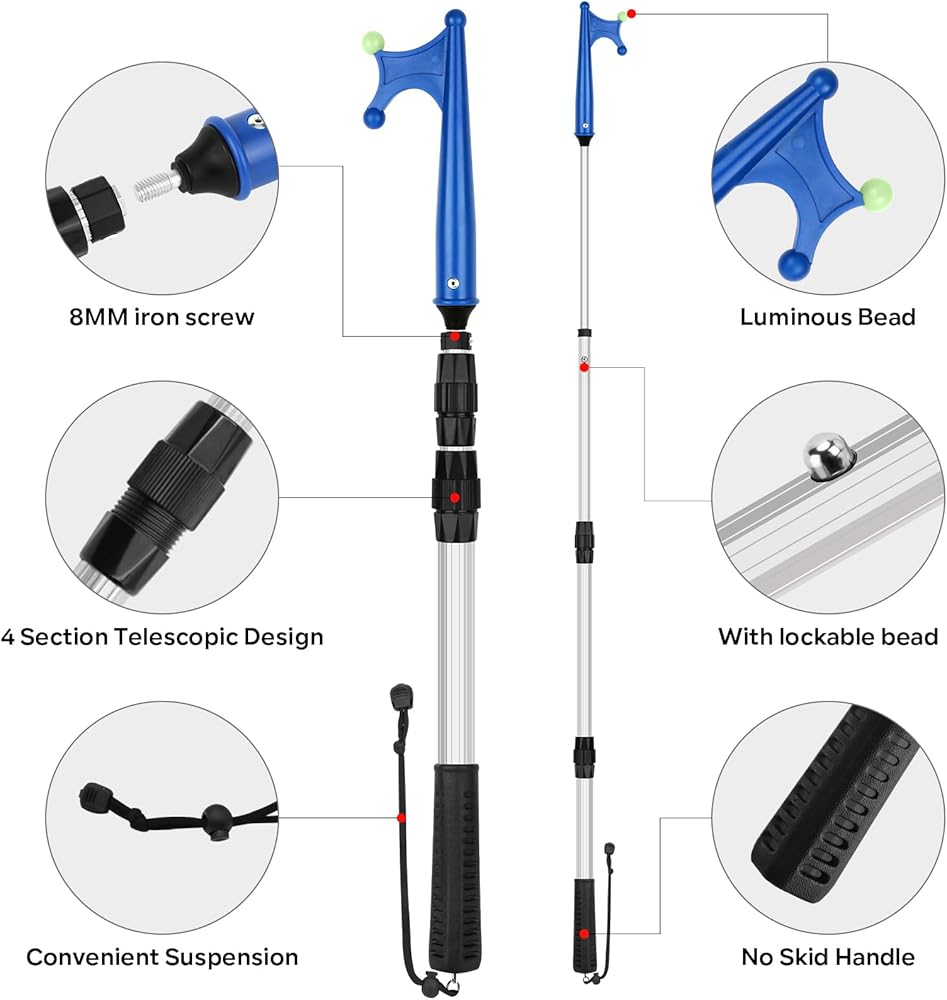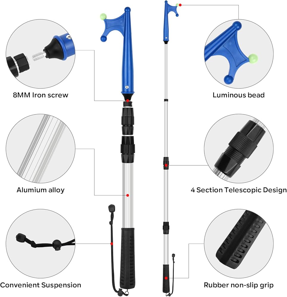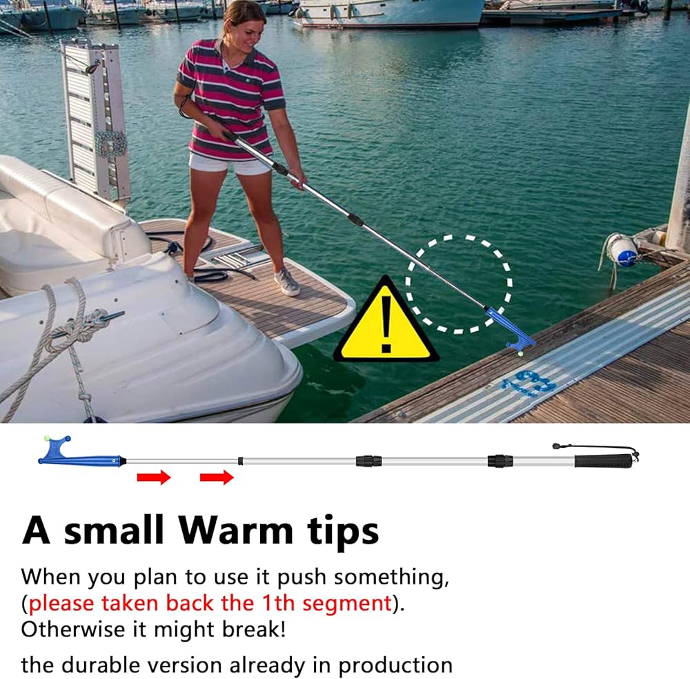 QUALITY MATERIAL -- Rust-proof aluminum materials, strong and durable mooring poles for boats. The boating pole hook with a non-slip rubber grips can provide enough friction even if you have a sweaty palms. A portable lanyard end of the dock hook to avoid loss.