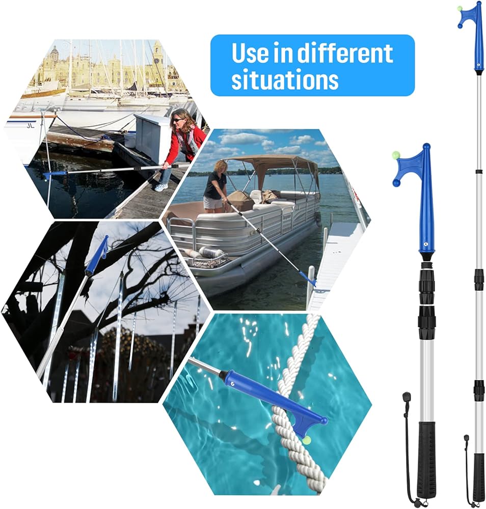 MULTI-PURPOSE BOAT HOOK -- Using the docking pole to grab a line or pull a pontoon boat straight up to the dock; use it to prevent hitting other boats, especially to park a pontoon boat in your spot, or pull our pontoon boat to your sea wall; And it also works well in hanging Christmas lights, docking, unhooking and grabbing.