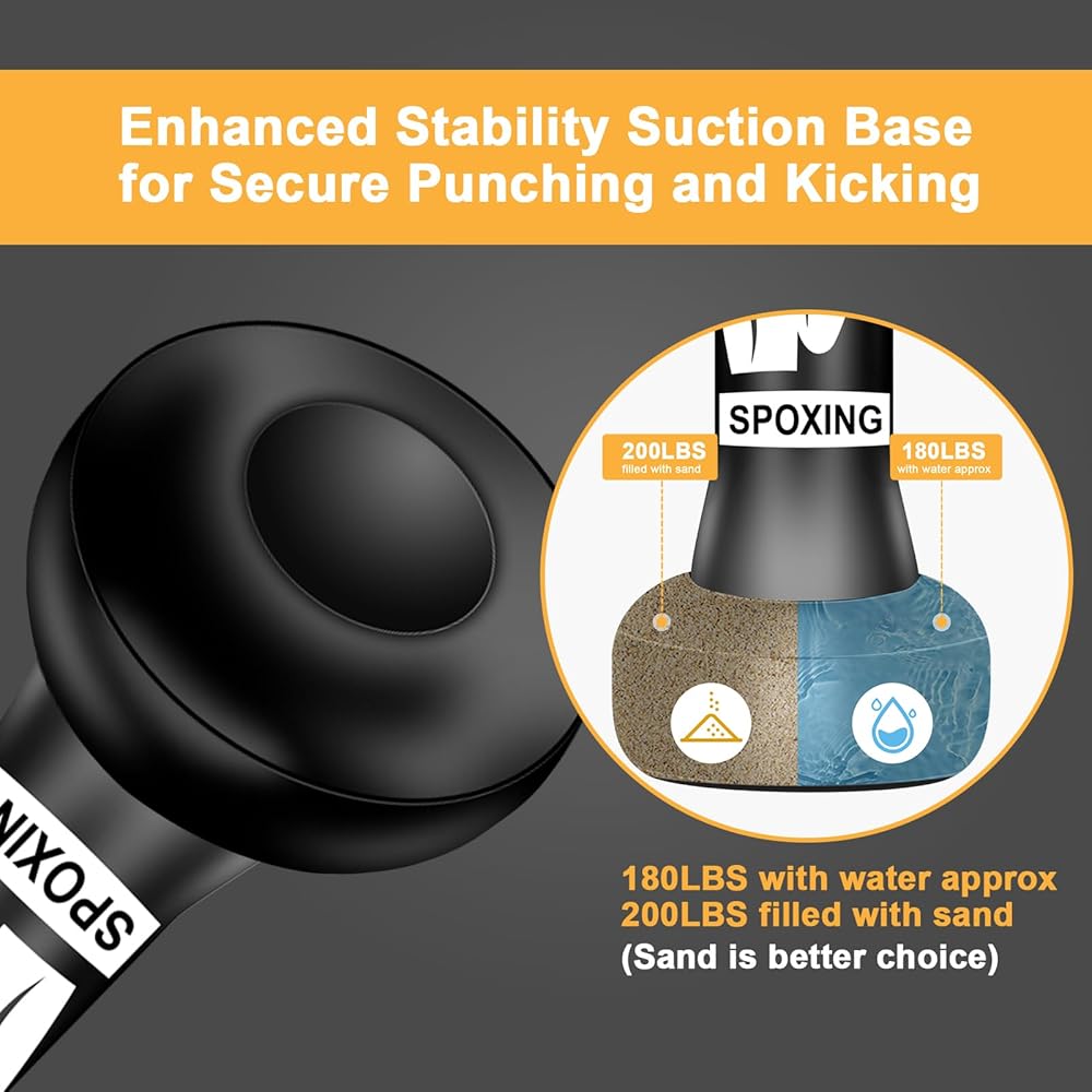 Stable Large Base Boxing Equipment: The thickened 0.5 MM PVC base effortlessly supports up to 80 kilograms of weight, capable of holding 180 pounds of water or 200 pounds of sand; Before using this heavy bag, be sure to fill the base with water/sand and then inflate it using the air pump; You can use either material or a combination of both to ensure stability; Sand is the preferred choice for added stability,Suitable for children aged 36 months and above.