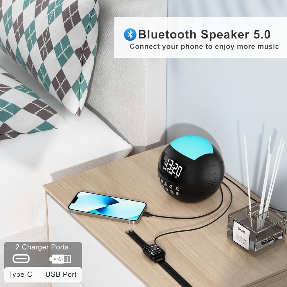 🍎【Multi-function & Quality Assurance】:Worth having a try! You only need to spend the price of 1 product to enjoy multiple functions, such as sound machine, bluetooth speaker, dual alarm clock, night light, phone charger. And, it has approved by FCC, CE and RoHS, don't worry about accidents.