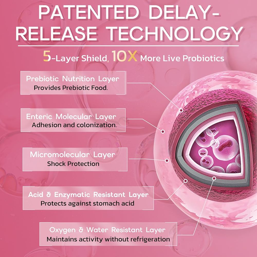 PATENT PROTECTION TECHNOLOGY, 10 TIMES MORE SURVIVABILITY - Our probiotic supplement features delay-release technology and delivery system that ensures strains can survive the stomach acids and 10 x more survivability deep into your intestine, makes the full trip from supplementation - to mouth - to intestines - to colon as live probiotics to help digestion, quickly and effectively adjust the intestinal microecological balance.