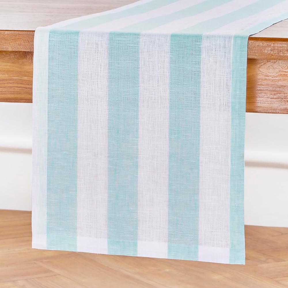 𝗖𝗼𝗺𝗽𝗼𝘀𝗶𝘁𝗶𝗼𝗻 𝗮𝗻𝗱 𝗖𝗿𝗮𝗳𝘁𝘀𝗺𝗮𝗻𝘀𝗵𝗶𝗽 : 100% Pure European Flax Linen Sky Blue and White Summer Table Runner - 𝗖𝗮𝗯𝗮𝗻𝗮 𝗦𝘁𝗿𝗶𝗽𝗲 | Handcrafted By Skilled Artisans.