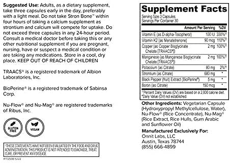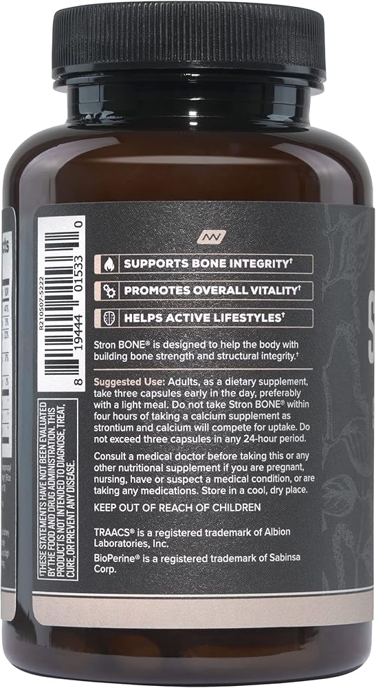 MADE WITH CAREFULLY SELECTED INGREDIENTS that have been suggested to support skeletal health, including Strontium, Vitamin K2, Vitamin D-3, Vitamin E, Magnesium, Potassium, Copper, Manganese, Boron, N-Acetyl D Glucosamine, MSM, Hyaluronic Acid, and Bioperine. Stron BONE is safe for men and women.