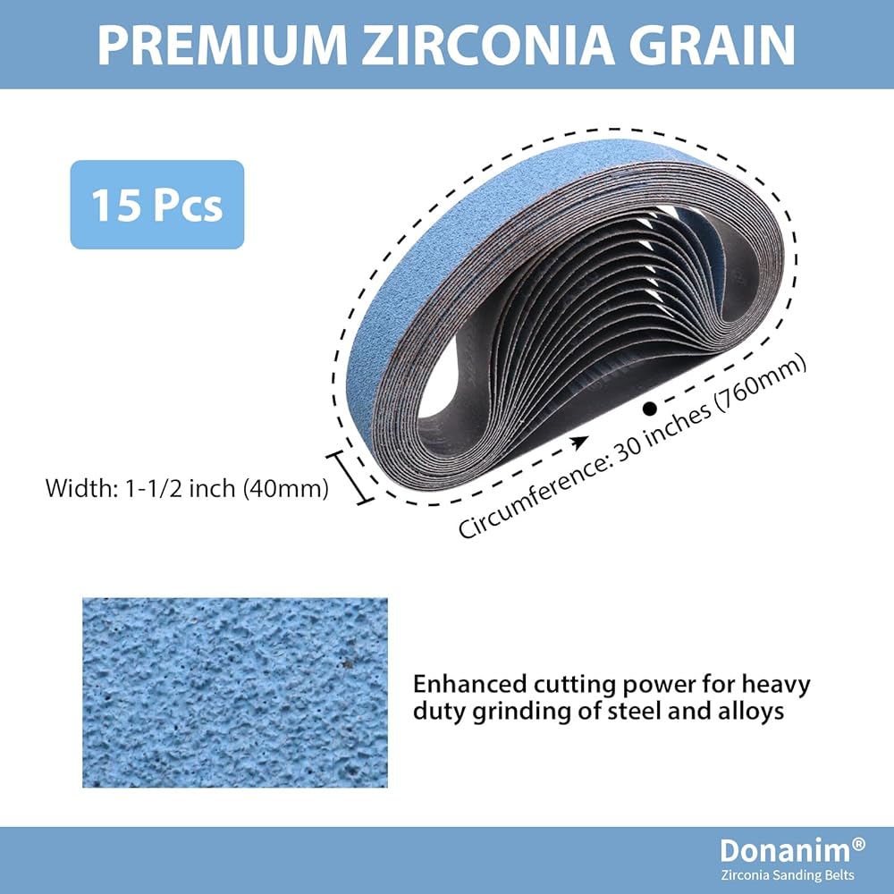 PREMIUM ZIRCONIA GRAIN: 15 pieces 80 grit 1-1/2x30" zirconia sanding belts are made of premium blue zirconia grain, wear resistance, thermal conductivity, and corrosion resistance, enhanced cutting power for grinding and shaping of metals and very hard wood