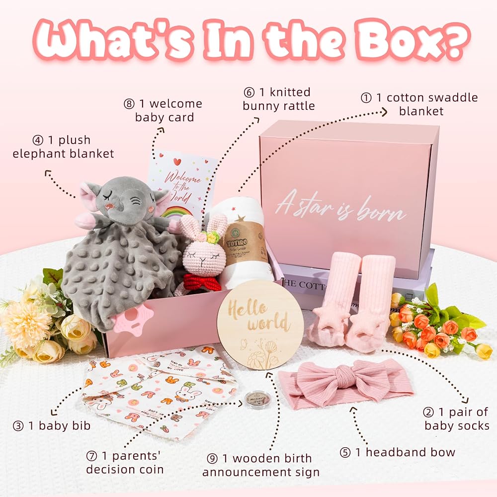【Personalized Baby Girl Gifts】Totiro baby shower gift is a thoughtfully curated collection designed to celebrate newborns in style. This baby gift set includes: swaddle blanket, bunny rattle, plush elephant blanket, pink headband bow, baby socks, baby bib, wooden birth announcement sign, "welcome baby" card, parents' decision coin and an elegant gift box. Celebrate a new life with a gift they'll treasure!