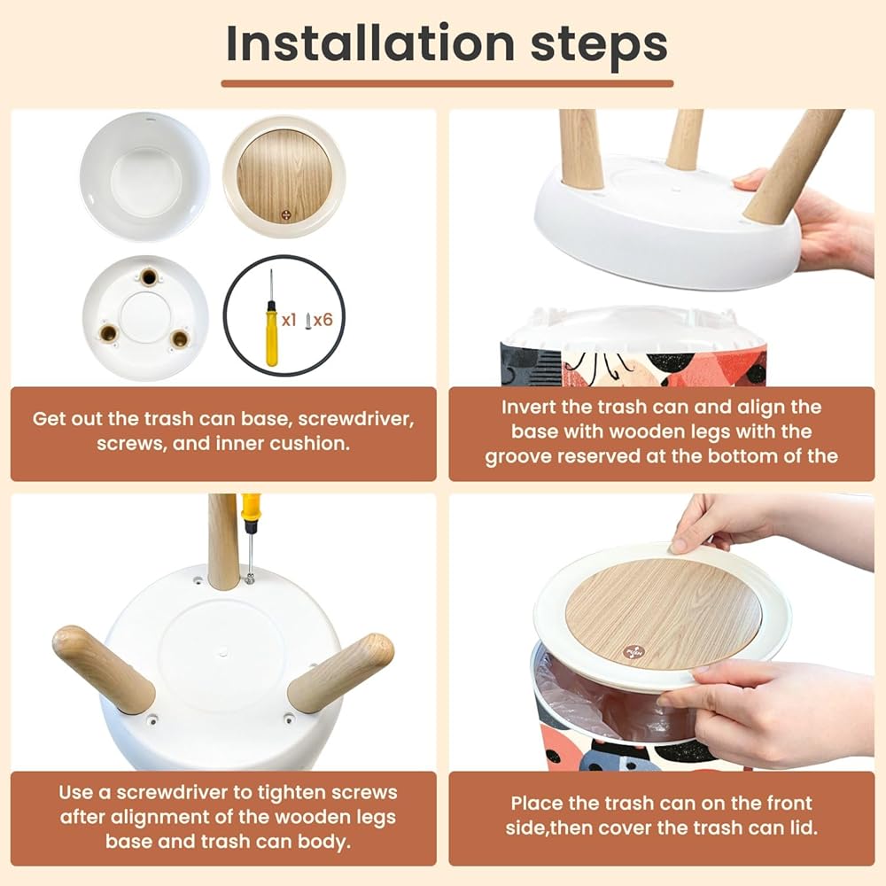 • Our garbage can has a slim design and exquisite appearance.No need to bend down to throw garbage. The high three-legged trash can is designed to keep your space dry and tidy.Each cute trash can is equipped with a round interior frame that will keep the storage bags in place.