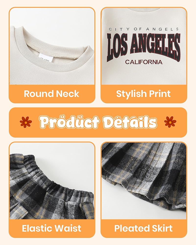 Charming Design of Baby Girl Clothing Set:Long sleeve toddler t shirt girls with cute graphic print--stylish and sweet;soft and loose fit sweatshirt with mid length pleated skirt dresses--offers much more comfort and space for your little girl while walking,running and playing;elastic cuffs,top hem and waist--not only provide a better fit for different body size, but also be much easier to put on and off.What a nice-looking and wearable matching skirt set