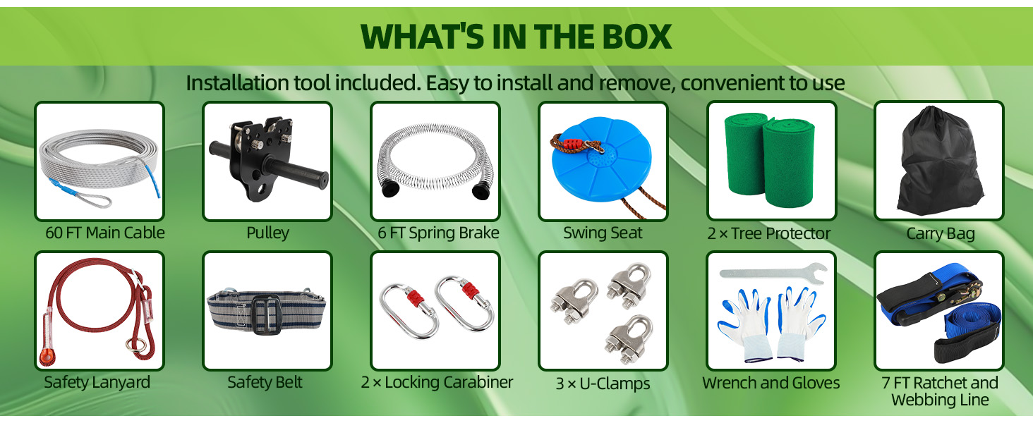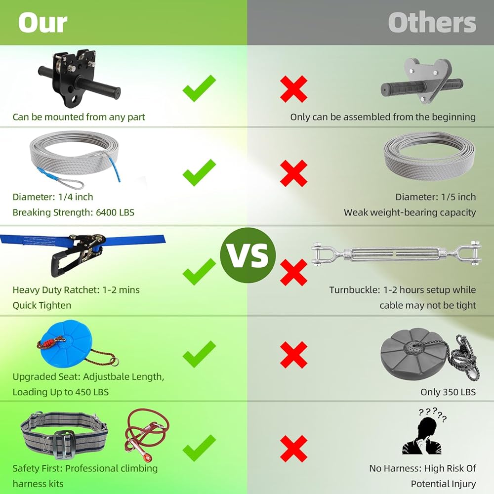 EASY TO INSTALL DESIGN: The zip line kit is equipped with an advanced ratchet fastening system that allows for quick and straightforward installation. Constructed with durable straps and ratchet webbing, the heavy-duty materials enhance safety for all users in backyard settings