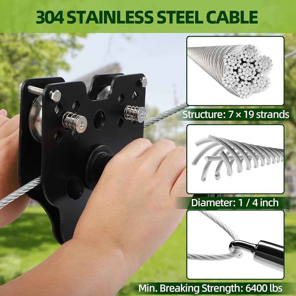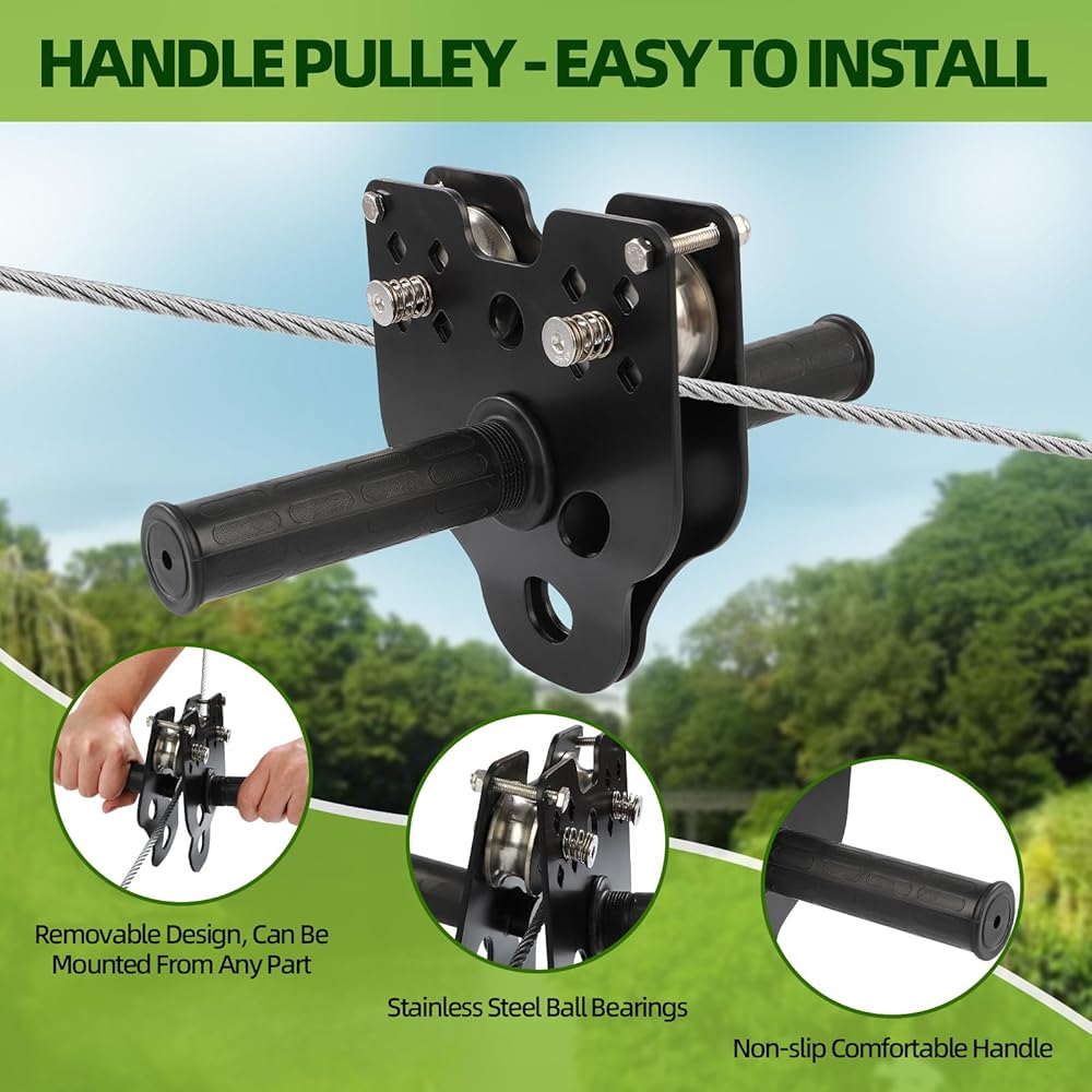 UPGRADED REMOVABLE PULLEY: The zip line pulley is constructed from double-layer stainless steel and features precision-sealed ball bearings for smooth operation. It is equipped with wear-resistant alloy pulleys, durable steel side plates, and non-slip rubber handles. The device can be conveniently installed or removed at any point along the steel cable by opening it from the bottom