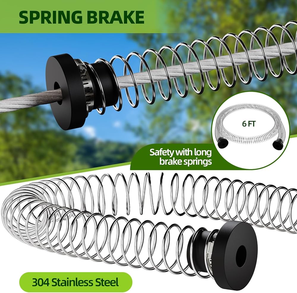 BACKYARD ZIPLINE KIT SAFETY FIRST: High-strength stainless steel cable and pulley system, safety lanyard, adjustable seat belt, swing seat, and an extended spring braking system to ensure optimal safety. The zip line supports a maximum weight capacity of up to 400 pounds. The seat height is adjustable, making it suitable for children of various ages and sizes