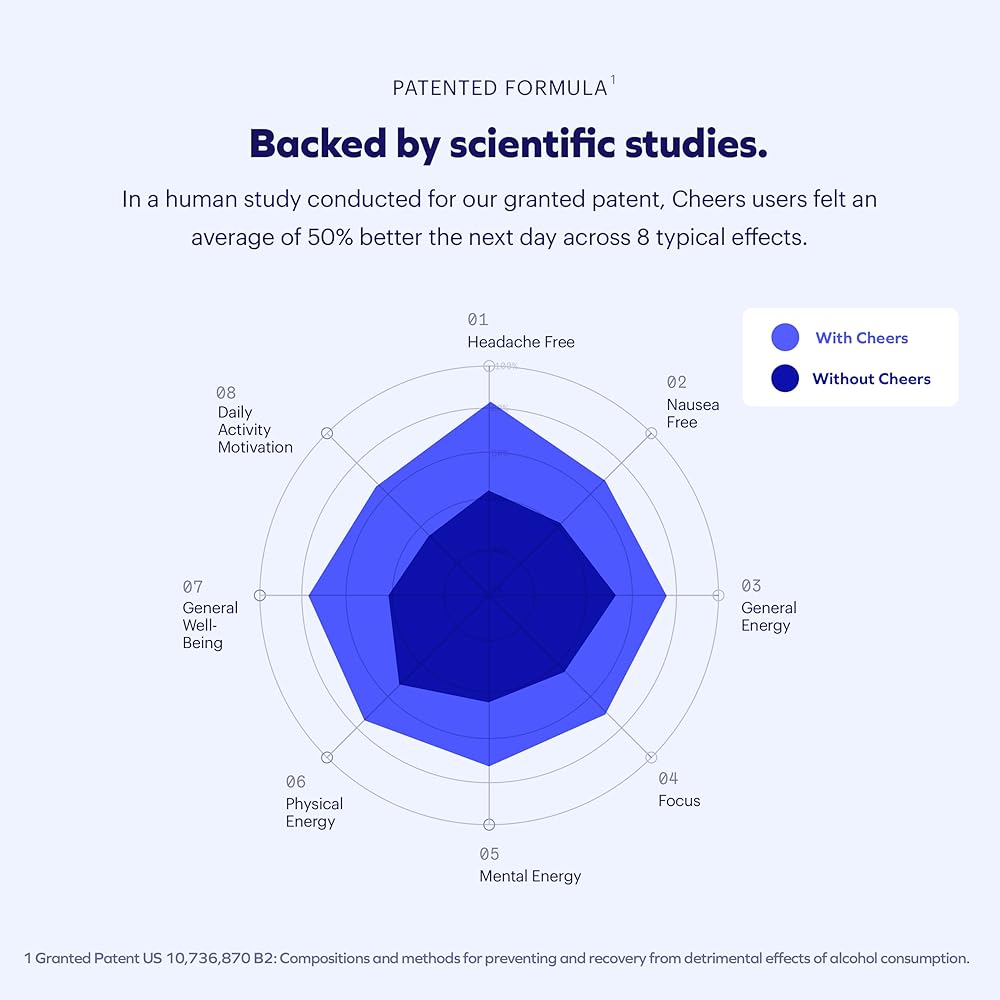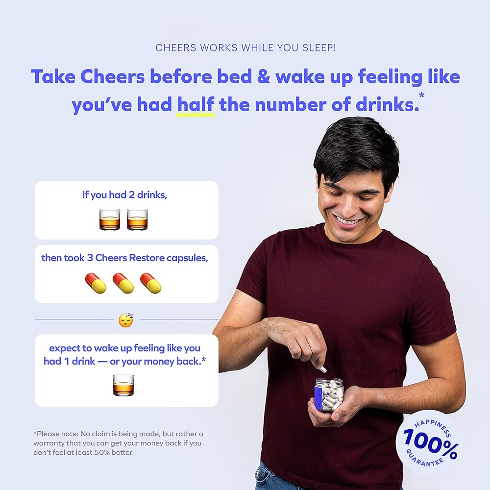 #1 in alcohol-related health: Cheers Restore is a natural, patented after-alcohol aid designed to help you drink smarter and feel at least 50% better the next day! Created by a team of PhDs, our Restore capsules work while you sleep to reduce GABAa rebound, promote acetaldehyde metabolism, and support overall liver health — helping you have a more productive morning.