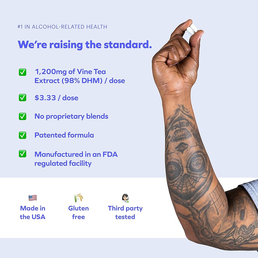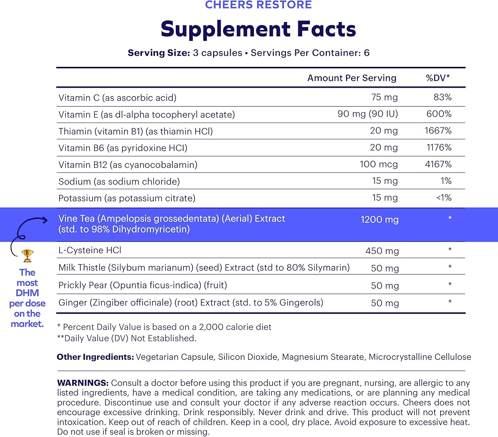 Most DHM per dose on the market: DHM has been studied in reputable publications such as The Journal of Neuroscience, showcasing its efficacy in reducing GABAa rebound, as well as its benefits to the liver. In our Restore formula, we pair DHM with high amounts of cysteine, which has been clinically shown to promote acetaldehyde metabolism, helping your body process alcohol more efficiently. Restore contains 1,200mg of Vine Tea (98% DHM) and 450mg of L-cysteine per dose.