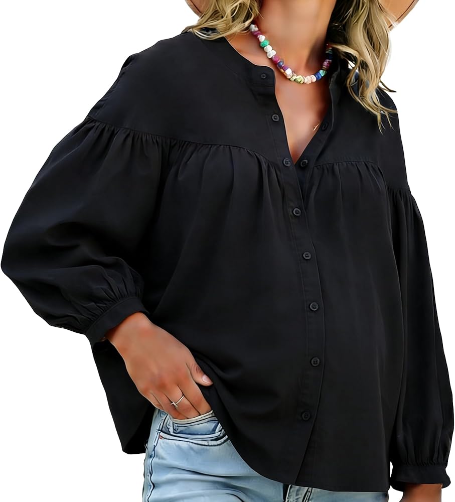 Design: A pleated detail tops, button down closure, loose fit tops for pregnancy, The Pleated design makes the shirt a special simple but charming.This Solid Color Lantern Sleeve Blouses Detail Adds An Extra Touch of Femininity for Women,The Loose Fitting Pleated Shirt Adds An Extra Touch of Femininity,Elevate Your Fashion Game and Suitable for Both Dressy And Casual Occasion.